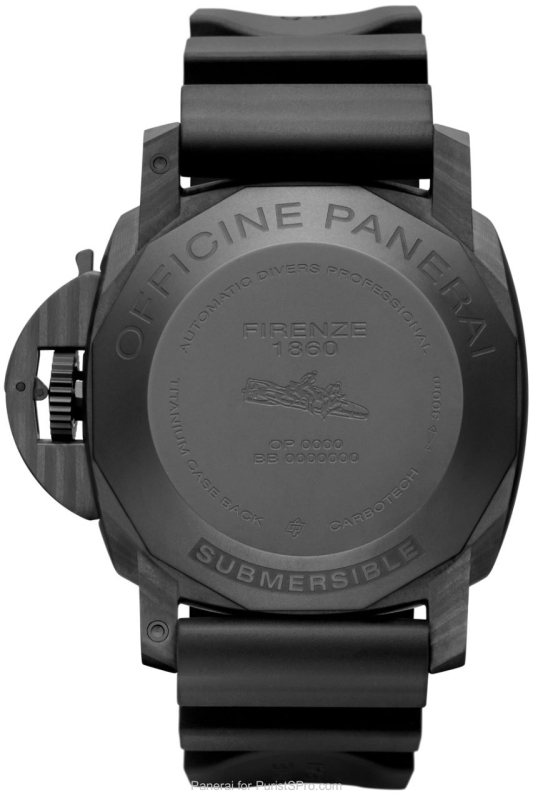 The dial of the new Luminor Submersible 1950 CarbotechTM is black with applied hour markers, the date window is at three o’clock and the small seconds counter marked by Panerai blue details is at nine o’clock. The screwin caseback, which helps to ensure the watch’s high degree of water-resistance, is made of titanium with black treatment and it is engraved with elements characteristic of the Panerai brand: “Florence 1860”, the city and year of birth of Panerai watchmaking, and the image of a Slow Speed Torpedo (SLC), the notorious “pig” on which in the 1940s the commandos of the Italian Navy sailed through the depths of the sea on their missions while wearing instruments made by Panerai.