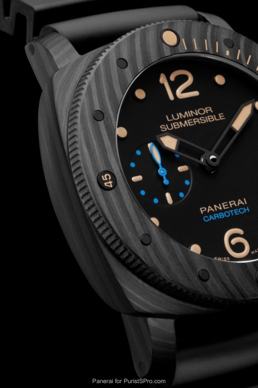 EVERY EXAMPLE OF THE NEW LUMINOR SUBMERSIBLE 1950 CARBOTECHTM IS UNIQUE AND DIFFERENT FROM ALL THE OTHERS THANKS TO THE SURPRISING TECHNICAL AND AESTHETIC CHARACTERISTICS OF CARBOTECH, THE NEW COMPOSITE MATERIAL WHICH IS MAKING ITS DEBUT IN HAUTE HORLOGERIE WITH OFFICINE PANERAI.