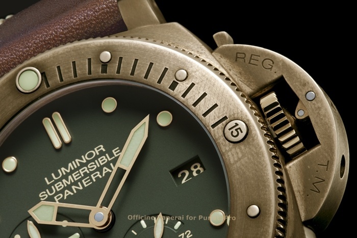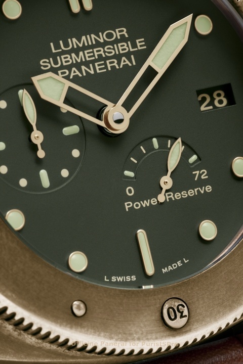 Immediately evident on the dial of the Luminor Submersible 1950 3 Days Power Reserve Automatic Bronzo is the important new feature which distinguishes this model: the display of the power reserve of three days on an arc-shaped indicator positioned at four o’clock. This very useful function joins the date display, the device for zeroing the seconds hand that is invaluable when synchronising the watch with a reference time signal, and the system for rapidly adjusting the time, the hand of which can be moved forward or backwards in jumps of one hour without affecting the running of the watch. The dark green dial, with applied hour markers, is surrounded by a studded bezel in bronze with the scale for measuring the length of the dive. The bezel is connected to the case by a special system designed and patented by Officine Panerai to ensure that the ratchet moves precisely from one click to the next.