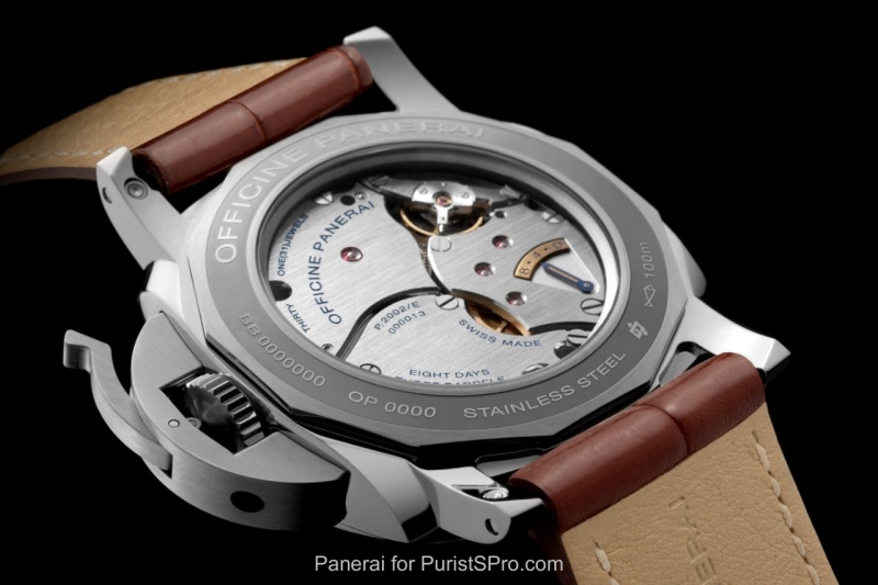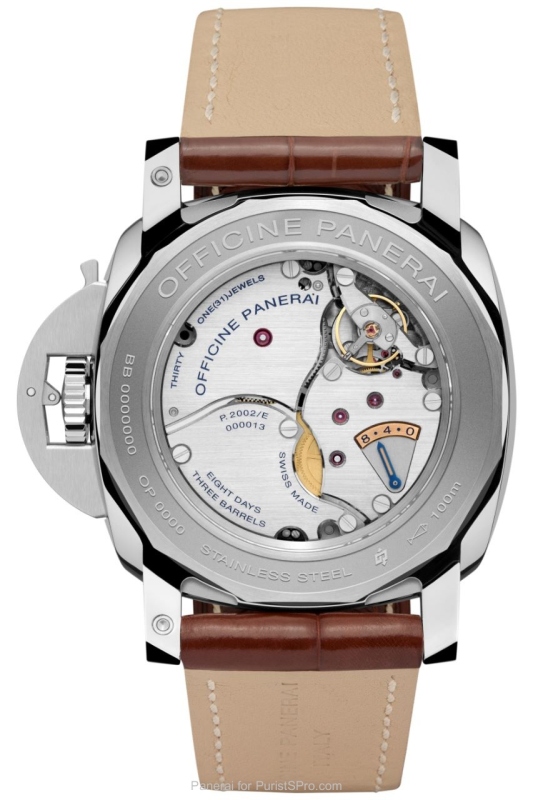 On the back of the case is a sapphire crystal window which enables the details and fine finish of the hitherto unissued P.2002/E movement to be admired. This is a development of the P.2002 calibre, the first to be made by Officine Panerai in 2005: it is a hand-wound movement with a diameter of 13¾ lignes, with three spring barrels providing the long power reserve of eight days which has been part of the tradition of the brand since the 1940s.