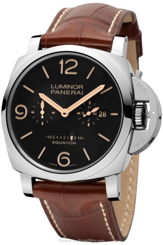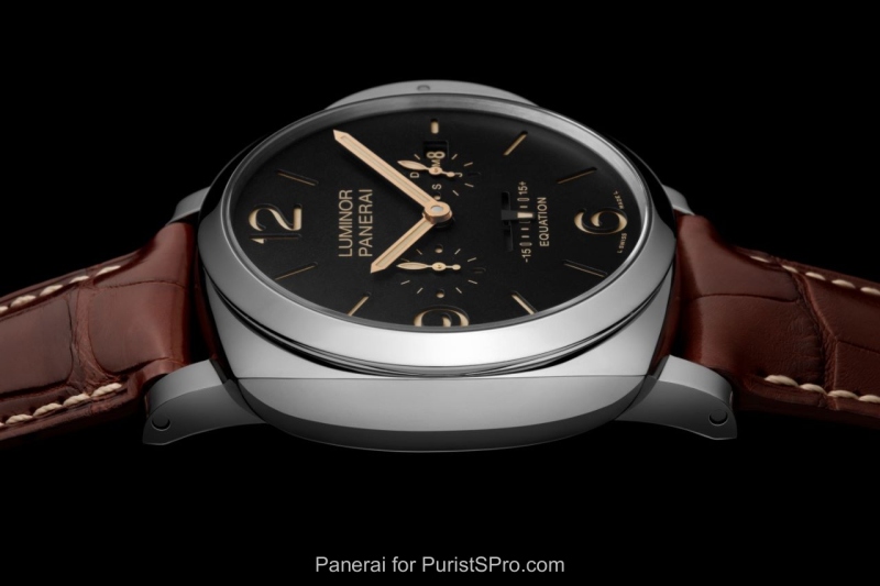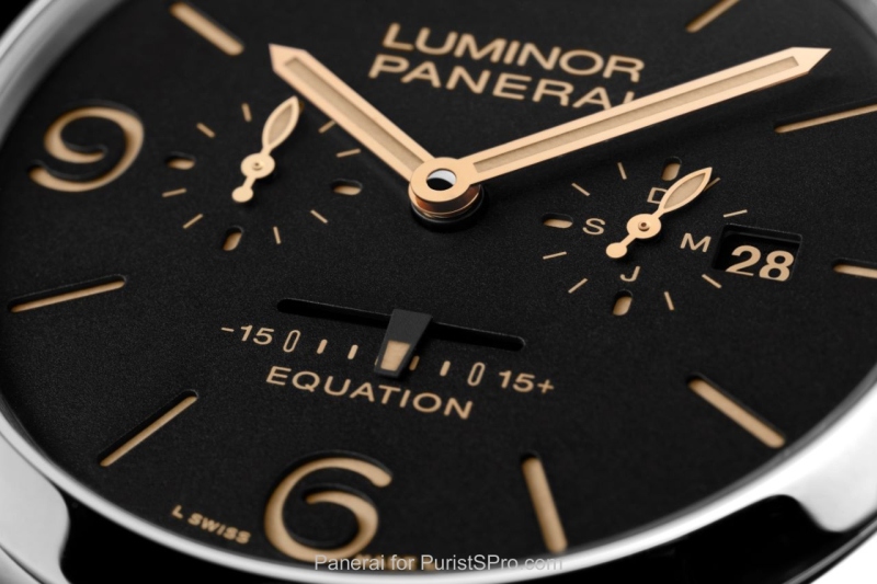 There is, however, a difference between convention and reality. Because of the elliptical orbit of the Earth round the Sun and the axial tilt of the Earth’s rotation in relation to the equator, the duration of a day measures exactly 24 hours on only four occasions in one year, while on all other days there is a difference between apparent time (solar time) and conventional time (mean time) which varies between being up to about 15 minutes ahead or behind, depending on the time of year. This difference, the measurement of which is one of the classic complications of high quality watchmaking, is called the “equation of time” and it is displayed by a linear indicator on the dial of the new Radiomir 1940 Equation of Time 8 Days and the Luminor 1950 Equation of Time 8 Days.