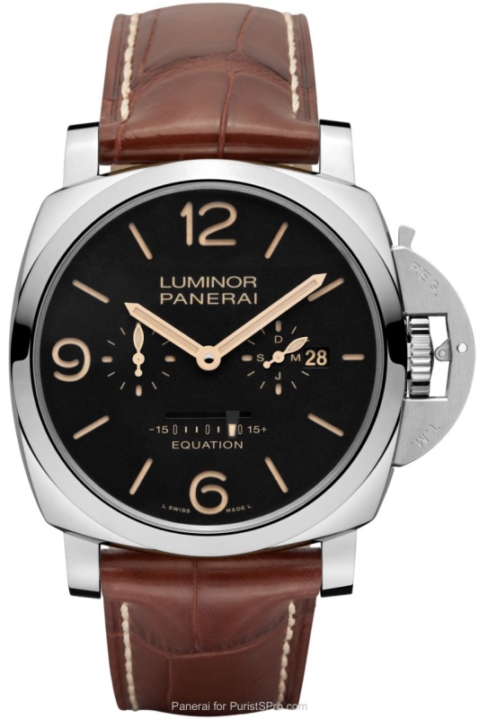 MOVEMENT: Hand-wound mechanical, P.2002/E calibre, executed entirely by Panerai. FUNCTIONS: Hours, minutes, small seconds, date, month indicator, equation of time, power reserve indicator on the back. CASE: 47 mm, AISI 316L polished steel. DIAL: Black with luminous Arabic numerals and hour markers. Date and month indicator at 3 o’clock, seconds at 9 o’clock, equation of time indicator at 6 o’clock. POWER RESERVE: 192H. WATER-RESISTANCE: 10 bar (~ 100 metres).