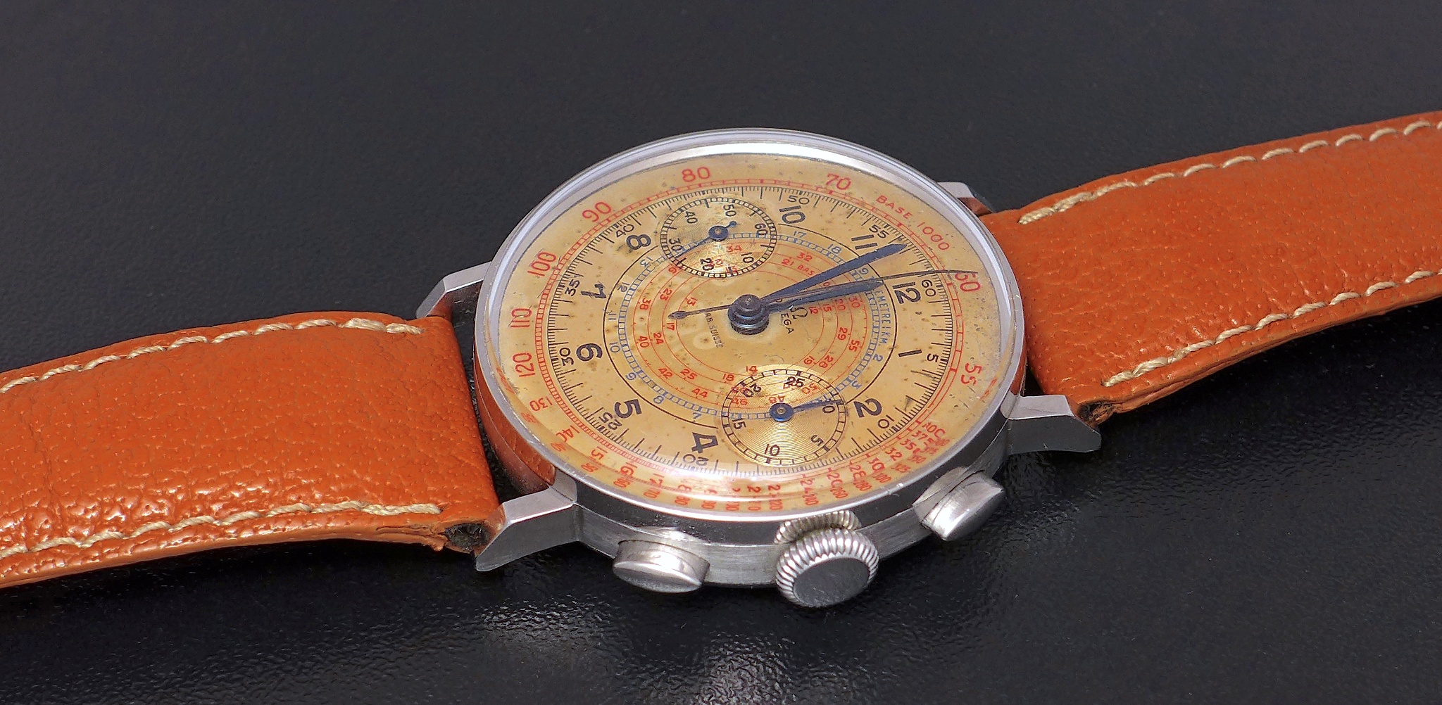 A wonder of a vintage Chronograph, from the 40's ( if my memory serves me well ). A 38 mm case and a splendid dial.
