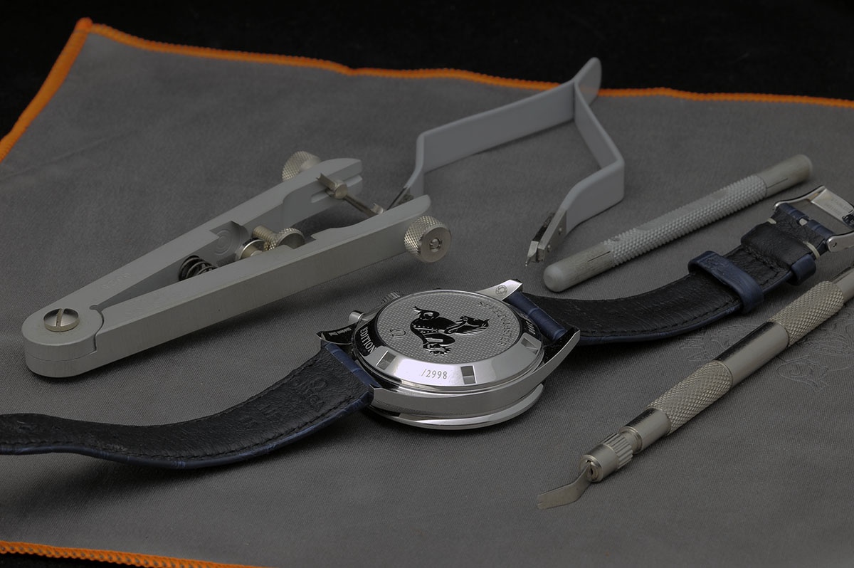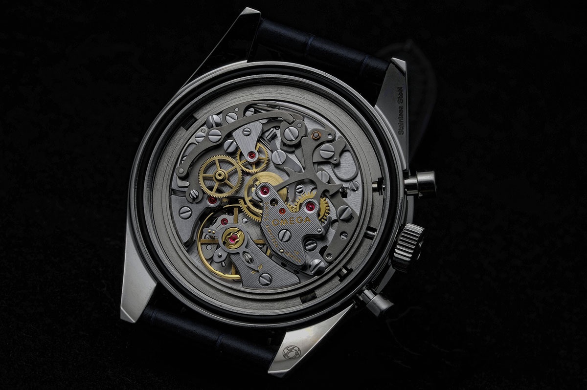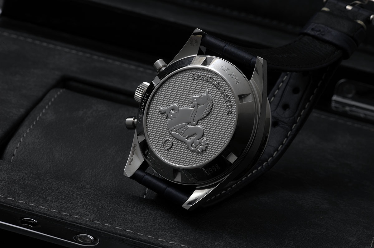 the CK2998 with the blue dial, lollipop secondhand and the blue ceramic bezel with Luminova. The case is 39,7mm so it's smaller than the current Speedmaster.Behind the solid backcase there is a manual Omega Calibre 1861 movement with 18 jewels and 21,600 bph, power reserve of 48 hours and it's not the same calibre that was at the original CK2998 that have calibre 321.