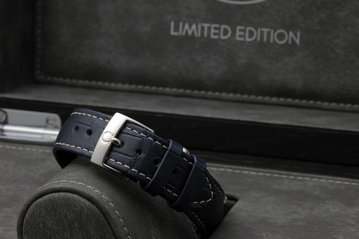 A blue leather strap with beige stitching and a polished buckle with a Omega logo.