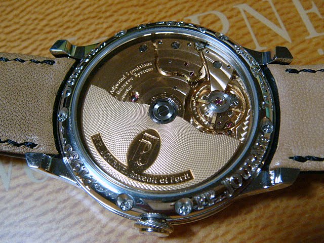 The case is a two-body, solid, polished, concave lugs, transparent case back with 6 screws, winding crown engine-turned with "cordes de Marseille" pattern, sapphire crystals.