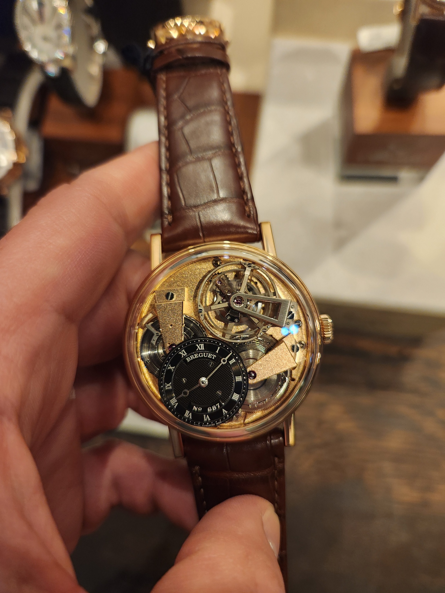 I attended an event hosted by Breguet yesterday evening and had the opportunity to get close and personal with some of their watches. It was the 1st time I really had the opportunity to try some on and view the details of their watches, especially the dials. My favorite was probably the Tradition Quantieme Retrograde. I was wearing my Saxonia Thin Copper blue for the evening.