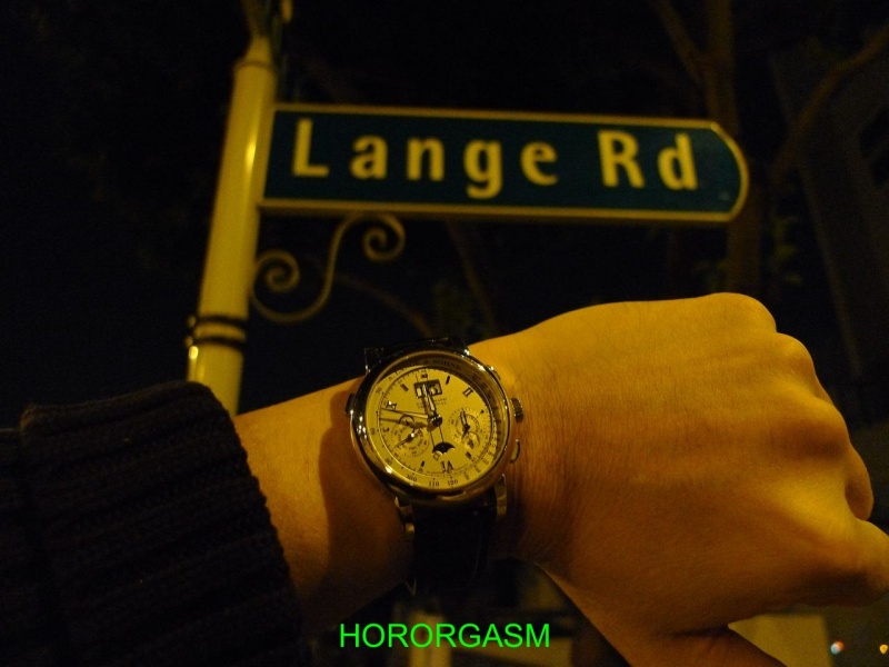 It is of course a wg Lange Datograph Perpetual. It combines two elements that I highly prize: a large date on a perpetual calendar, and the magnificent Datograph base movement, made better now with a free sprung balance. It offers great convenience as well, as the pusher at 10 o'clock advances all indications one day for each push. Thus, if the watch runs down it can be reset in a flash; PP offers that with the 3970, 5970 and 5270, but with those one must fish for a toothpick or tool. The Lange offers a pusher, which only works when the crown is pulled; a nice touch since the calendar cannot be advanced inadvertently with that protection.
