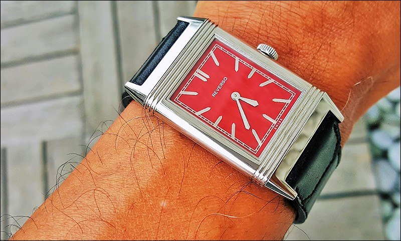 en face shot with a little symphony of blue background, white symbols, and red accents. And a superb watch, also.