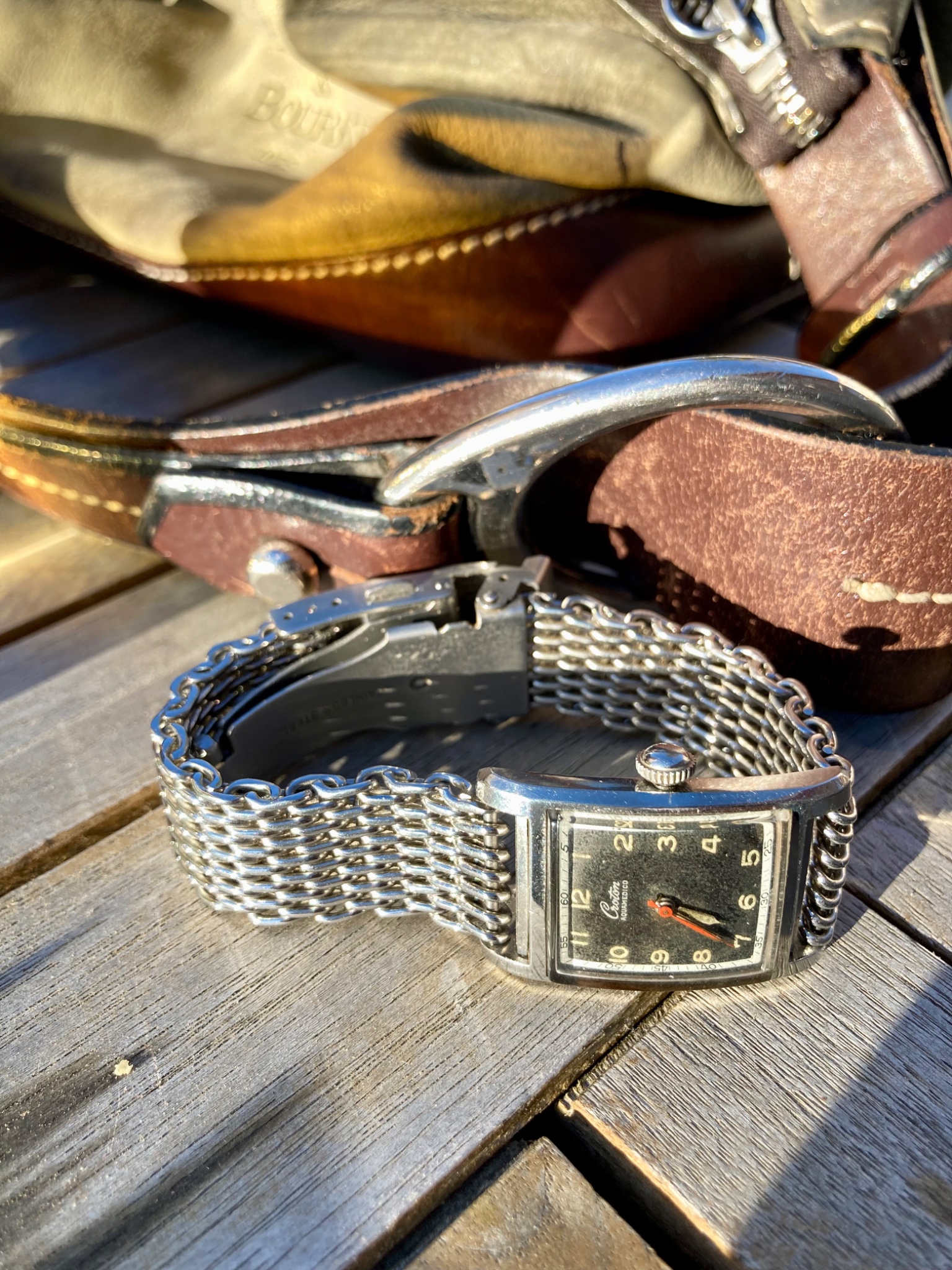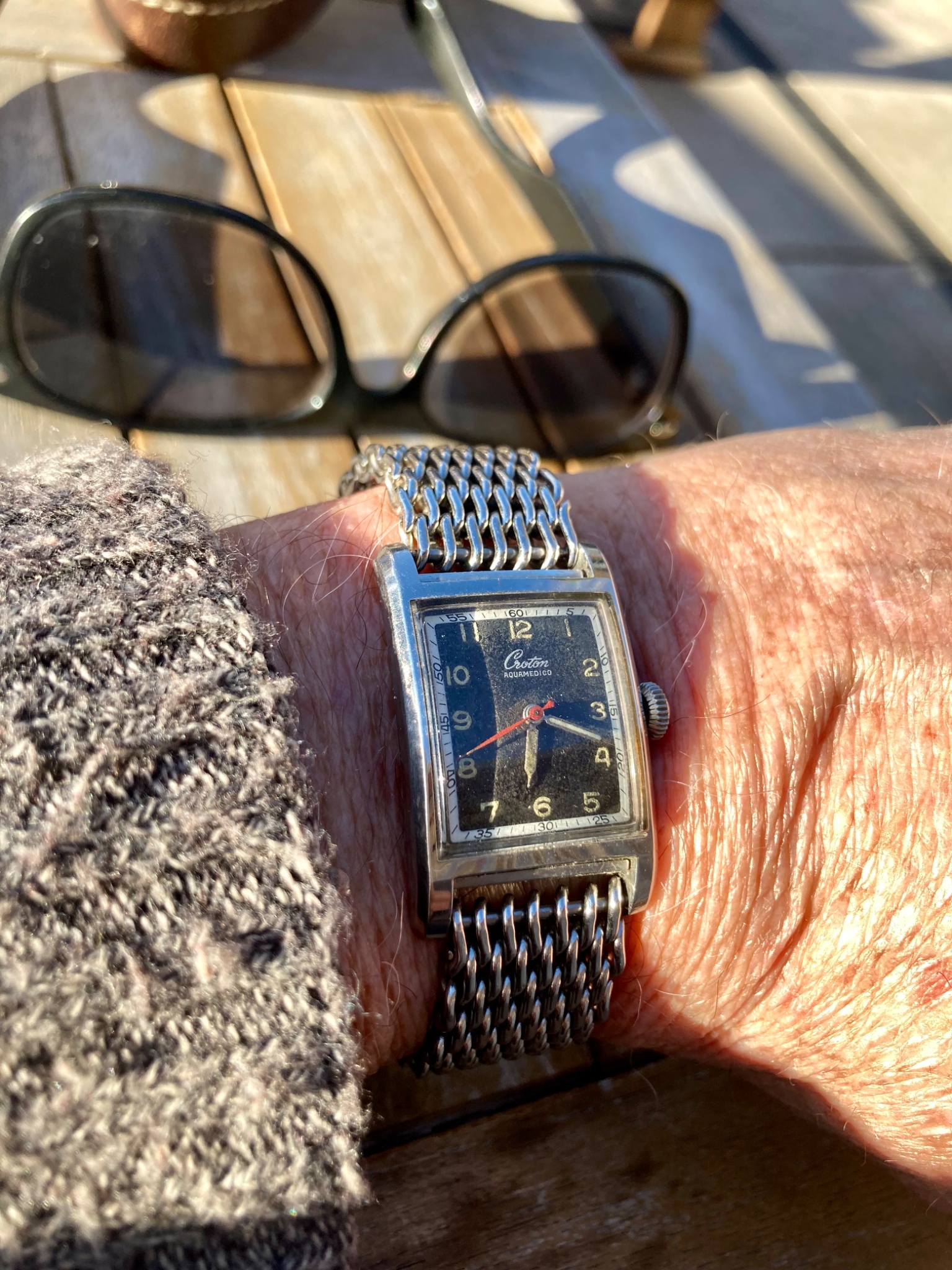 Here's my watch for the day. Croton Aquamedico Tank on Shark Mesh. Circa 1940's. Was my Dad's daily for a long time. Not quite a Gondolo but like they say in racing...Run What Ya Brung.