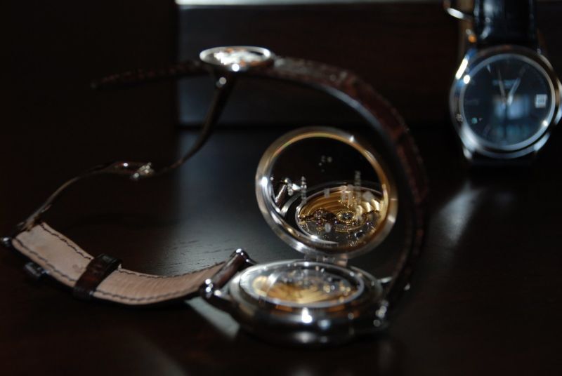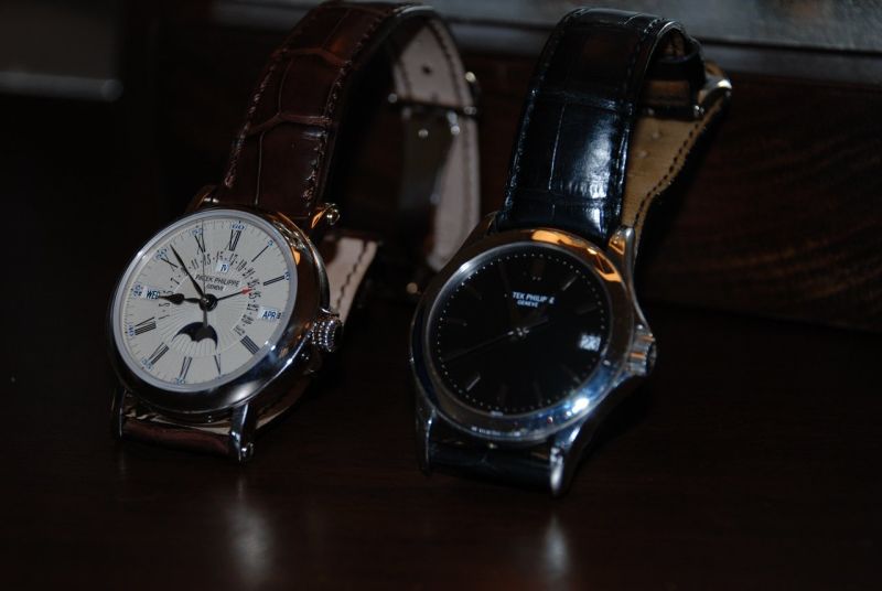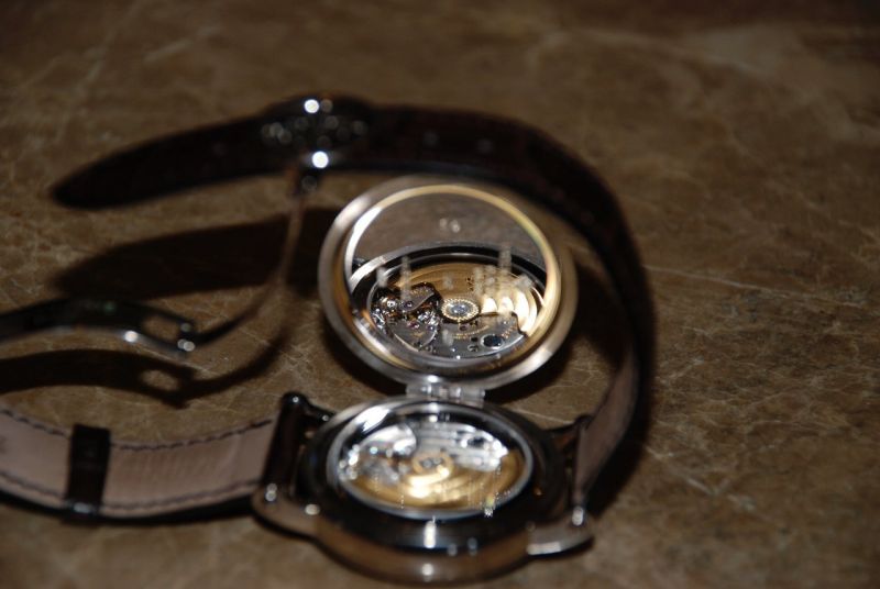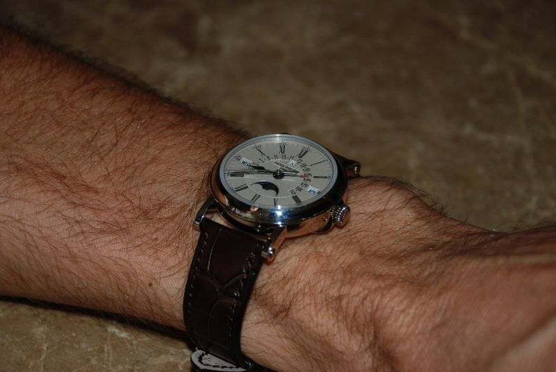 Sorry for the darkness of these pics. Watch feels a bit like an old friend.. I find it actually rhymes a bit with my 5970. The case thickness is the same as the 5059 but the diameter makes everything feel more correct, comfortable. The rounded curves feel really good (much more comfortable than I imagined) on my wrist. I could see this being a regular daily wearer for a while.. Poor quality pics attached.. Forgive the smudges, I literally just cut it out of the plastic prior to snapping. I've thrown in my more comon 5107p (also a bit smudgy [appologies]) to give you something to compare the size to. Some cool movement shots in the reflection of the officer's-back... also, was surprised to find it came with a PP fold-over clasp. I heard they were eliminating that PPcrest fold-over on new models.