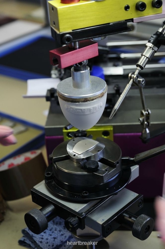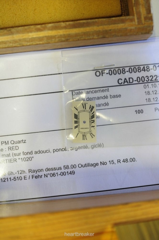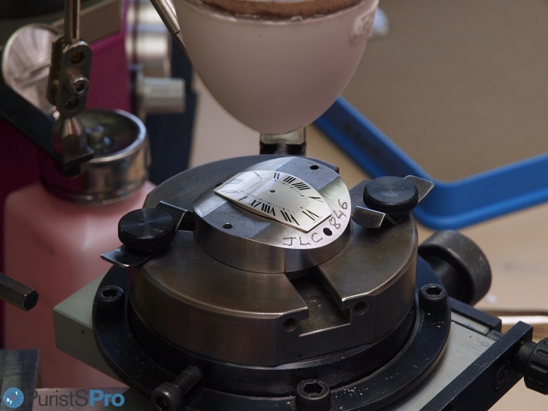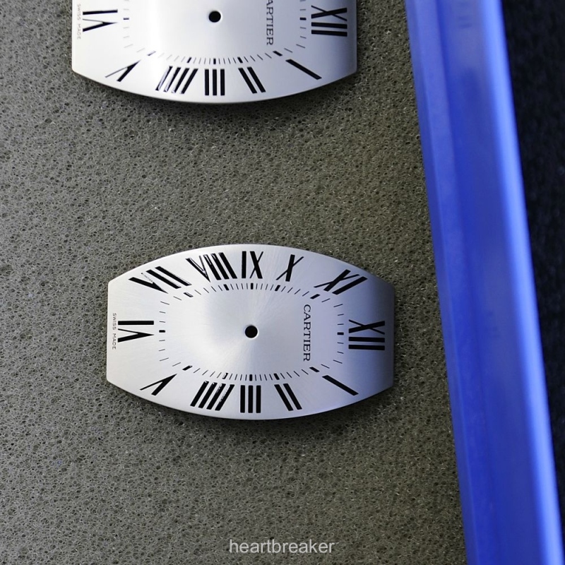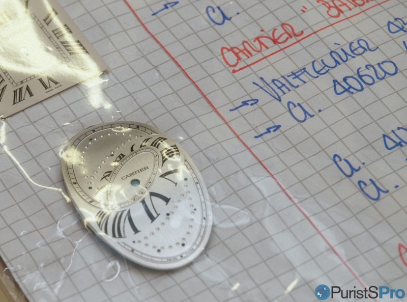 A matte surface is not simply a matte surface, but parameters like granularity, depth and pressure crucially determine the shine of the dial. On the left, note the Cartier dial mounted on the support.