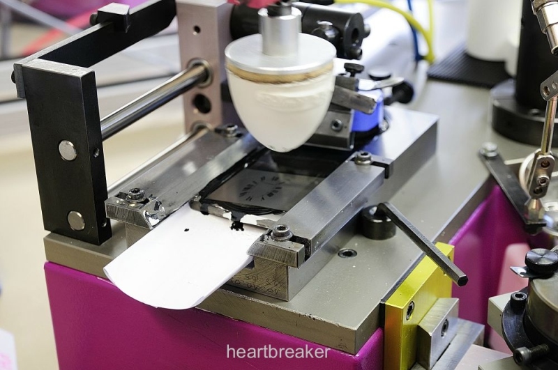 The more we proceed in the factory visit, the more the dials are close to the final look. Of course, it's a banality, but this theory has a corollary: for the second time in this factory visit we're able to recognize an operation, having seen it frequently, even on some watch catalogue. We're talking about the Tampography (décalque, also known as pad printing). The first time we've immediately guessed the purpose of a machine was when we've seen a rose machine, used for applying guillochage.