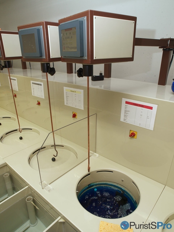 Fehr S.A. offers both types of surface colouration. As also the electroplated dials receive a protecting surface layer of lacquer (varnish), we will describe the process using such a dial and start with the "galvanoplastie" means electroplating: during this process a metal coating is electrochemically applied on the dial, to give it the desired hue.