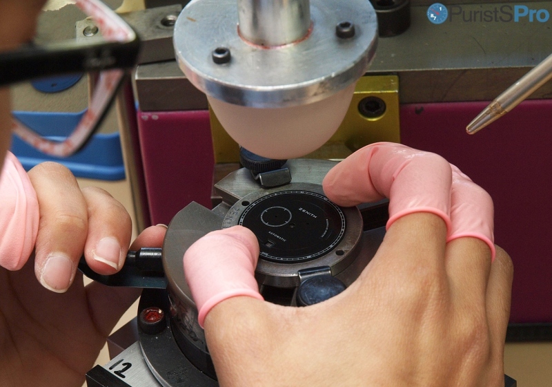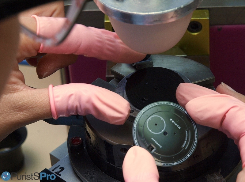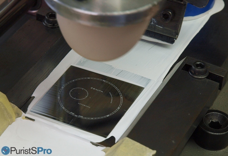Quite a number of different dials are made in parallel. Here you can see another very famous dial (and the output should be familiar for Zenith lovers...). Inking the silicone pad...