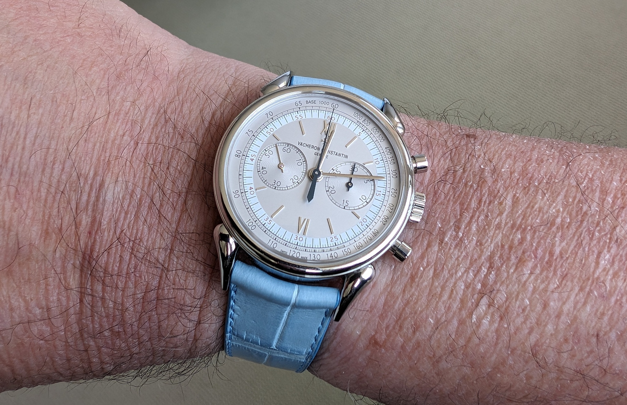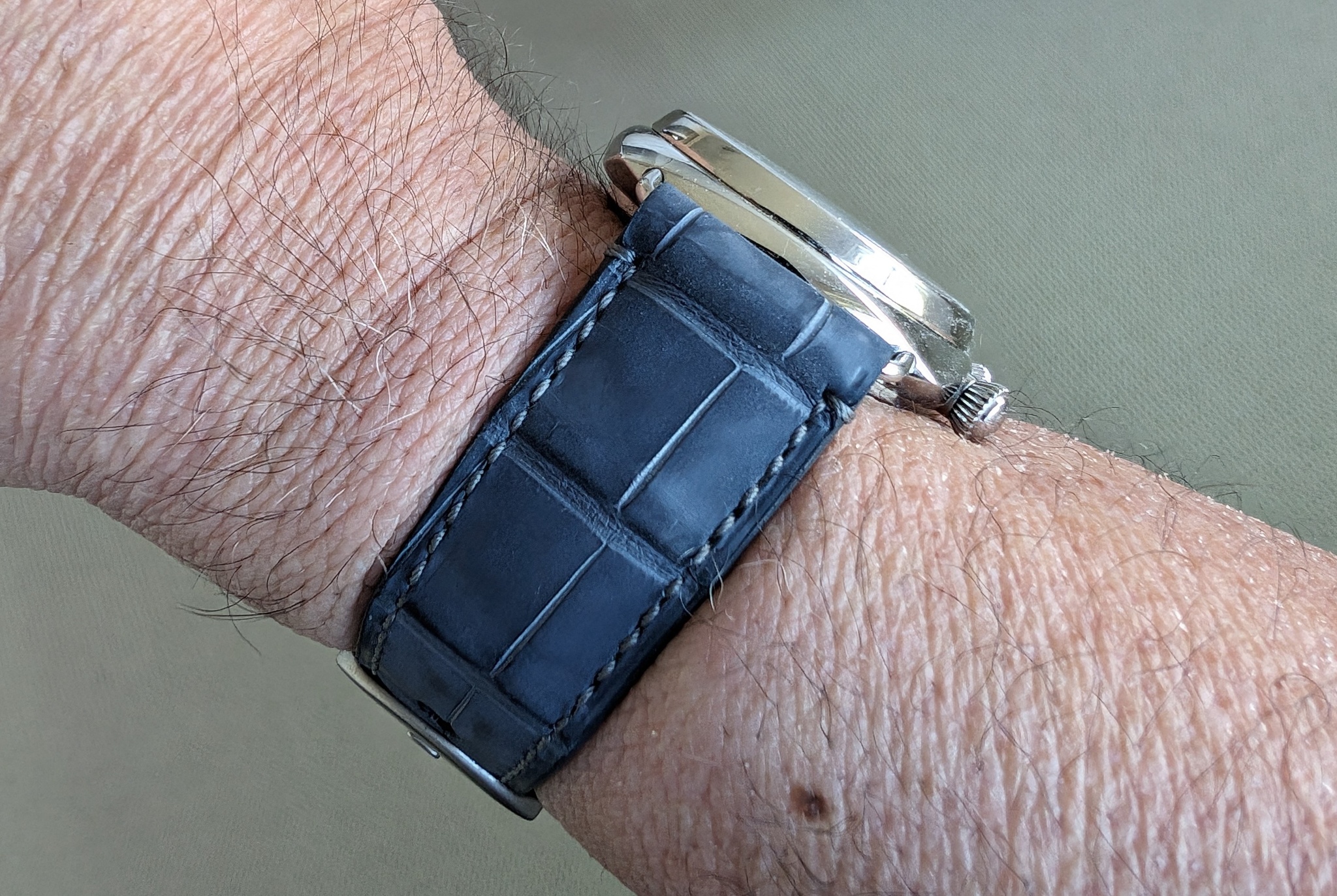 I was hoping to solicit forum members’ opinion on a choice between two straps for the platinum CdV. The main difference between them is that one has a glossy finish while the other is matte. The first picture below is of a very stylish gentleman who is wearing a custom order VC strap with denim color (that’s the name) in a glossy finish.