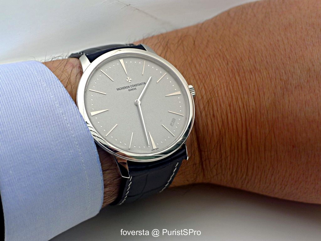I have to be honest with you: I was very afraid by this Patrimony Contemporaine Excellence Platine when I read the Press release. 42mm!!! For a watch with a thin bzel, without a second hand... I found the Vacheron decision to propose a version with an enlarged case of this Patrimony Contemporaine quite surprising. I was expecting to see a watch with the famous "fried egg" syndrome, you know, when a watch has a large diameter and a thin height...
