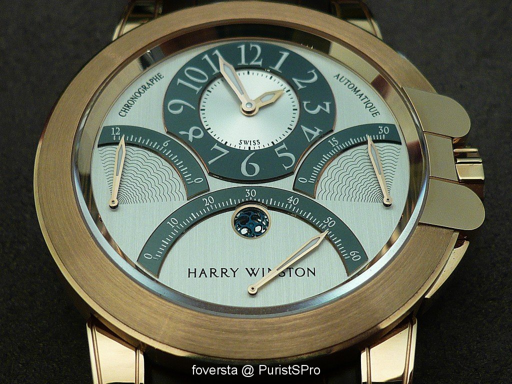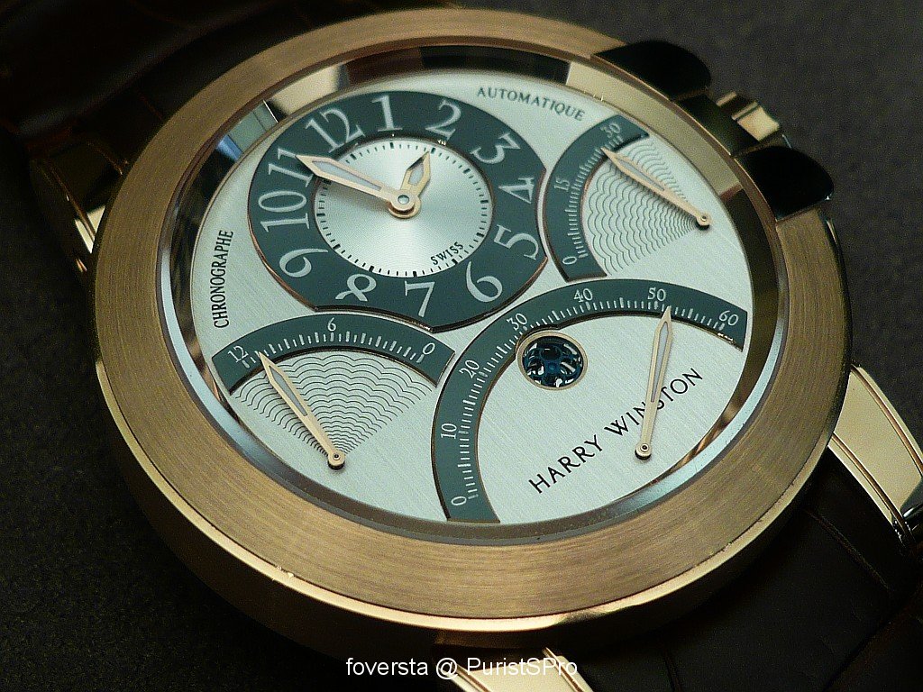 Even if the base of the movement is very well-known and not exclusive, this Ocean Chronograph seduced me thanks to its very balanced dial and the perfect integration of the pushers. These two « details » give a lot of charm to the watch. Harry Winston managed to create a watch which blends with success originality and elegancy. Moreover, the trouble of some retrograde systems is that they don't really improve the readability of the functions: it is not the case here thanks to the perfect organization of the dial.