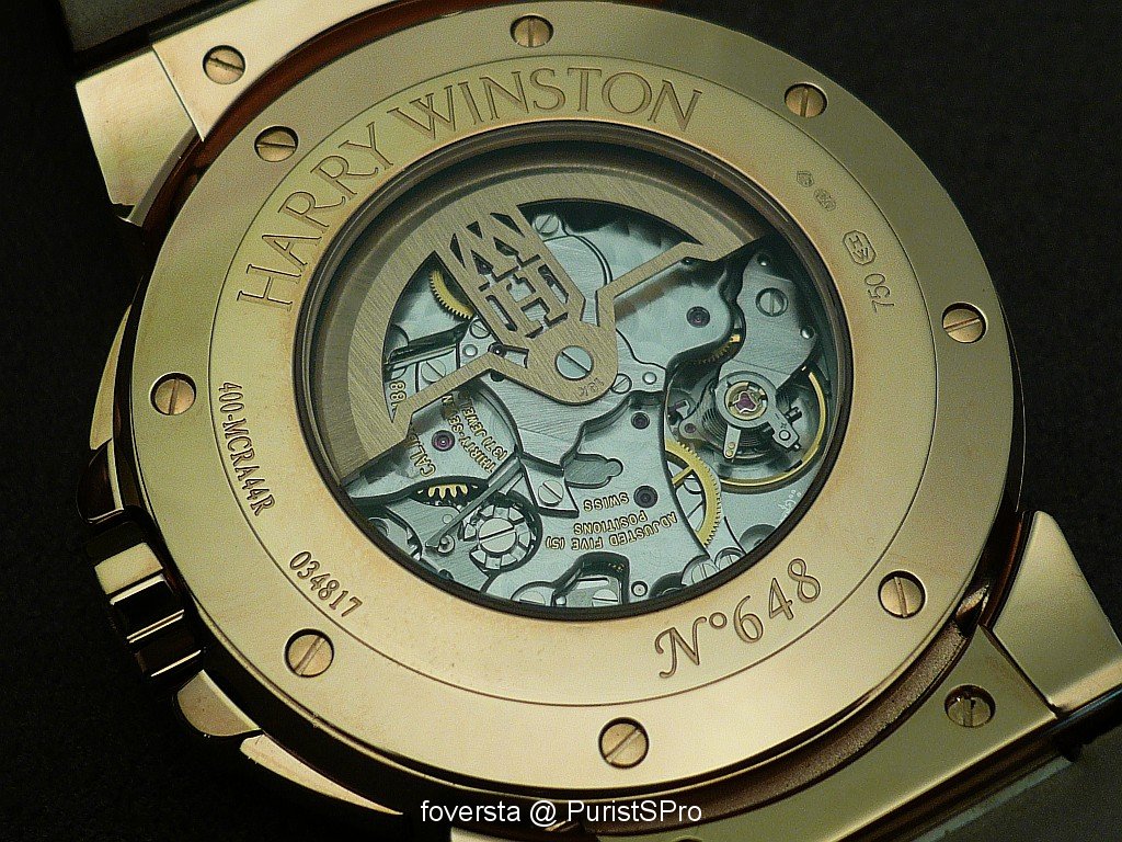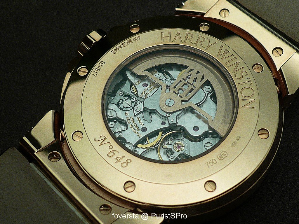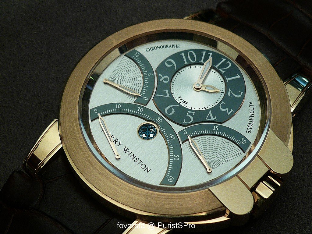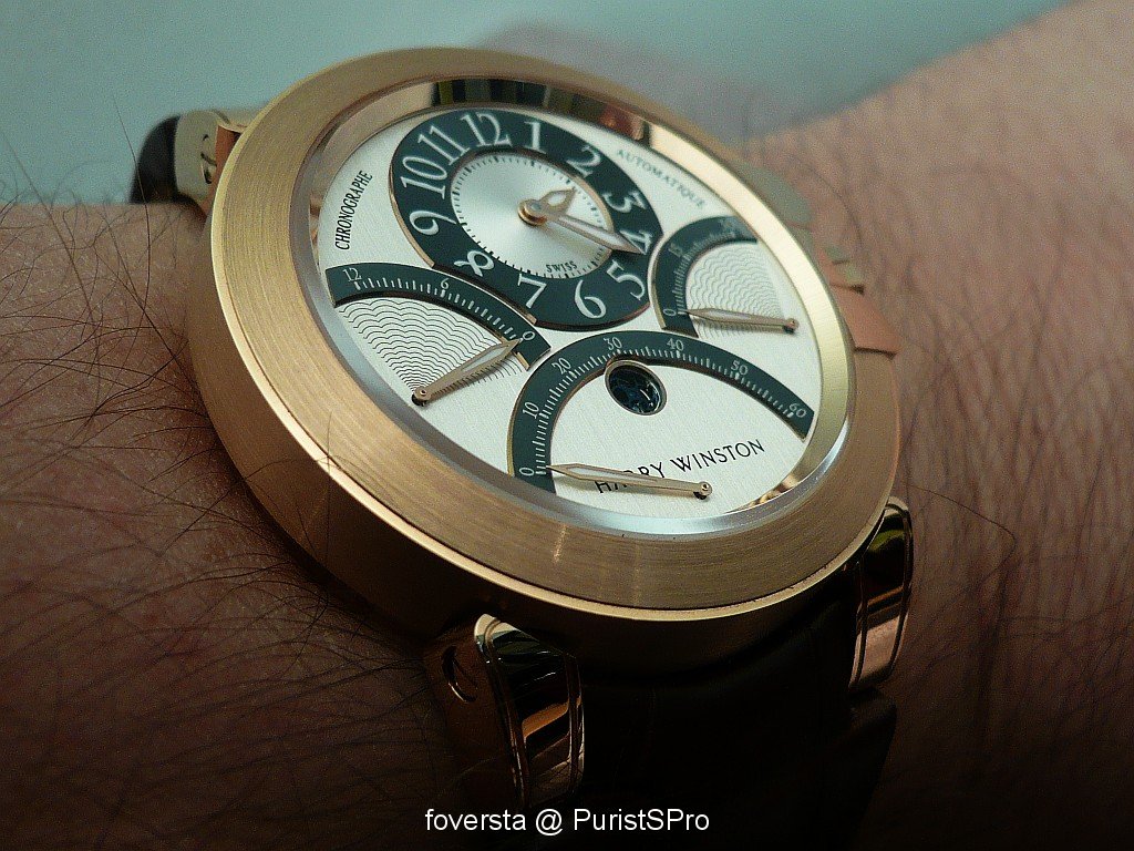 At first glance, we know that it is a Harry Winston watch thanks to its very charasteristic case. Look at the parts on the right side around the crown: again, they have the same shape than the arch of the entrance of the NY Boutique. Thay also bring another plus to the case design: they favour the perfect integration of the pushers in the case. These pushers seem to be very discreet and it is a true pleasure to operate them. Thanks to this integration, the right side of the case is as elegant as the left side.