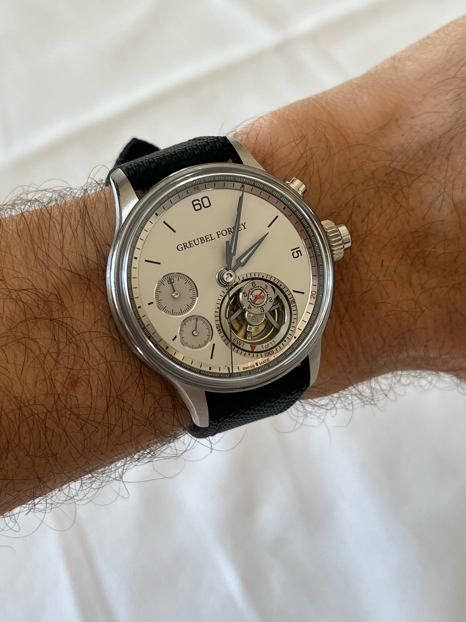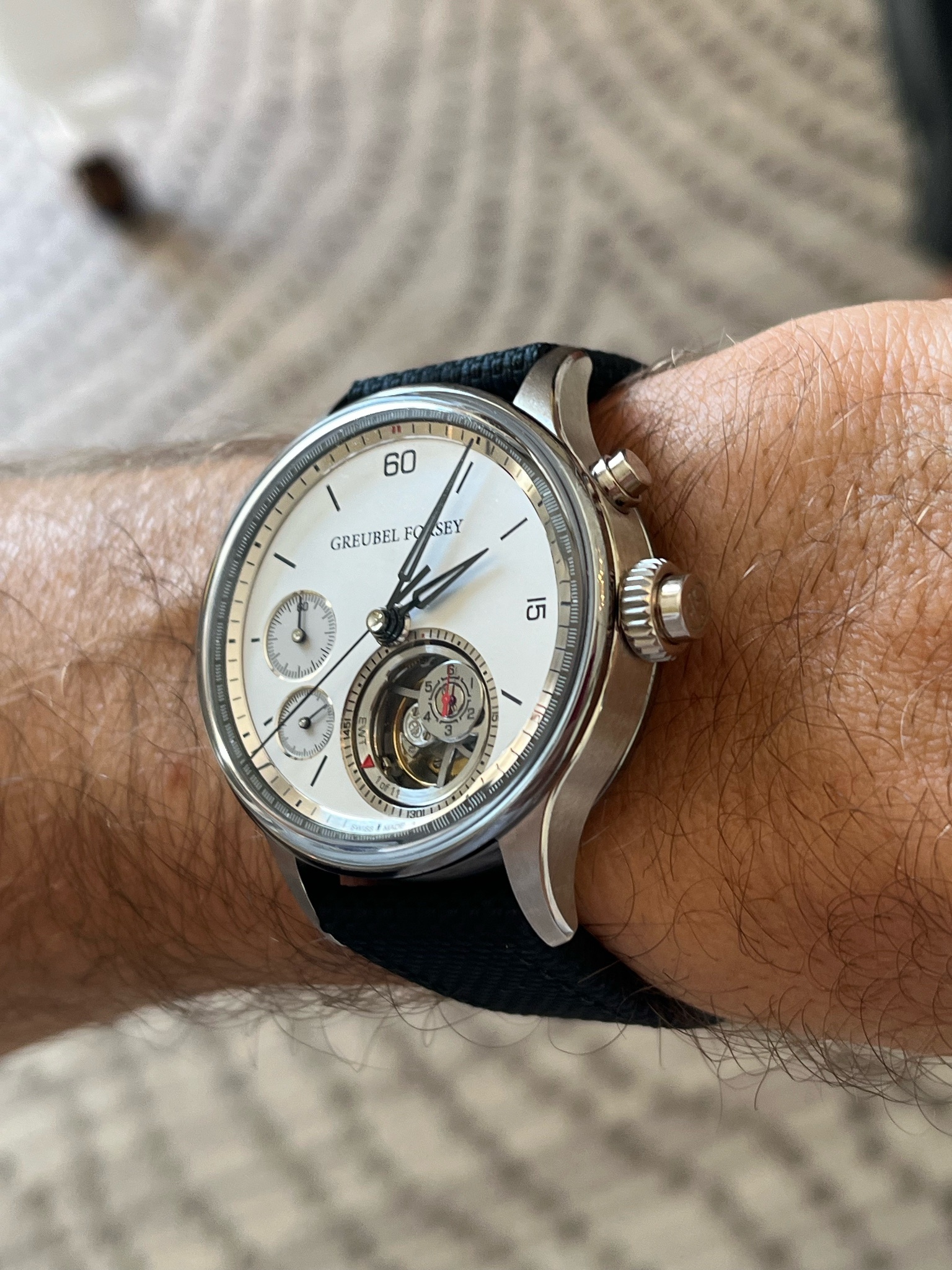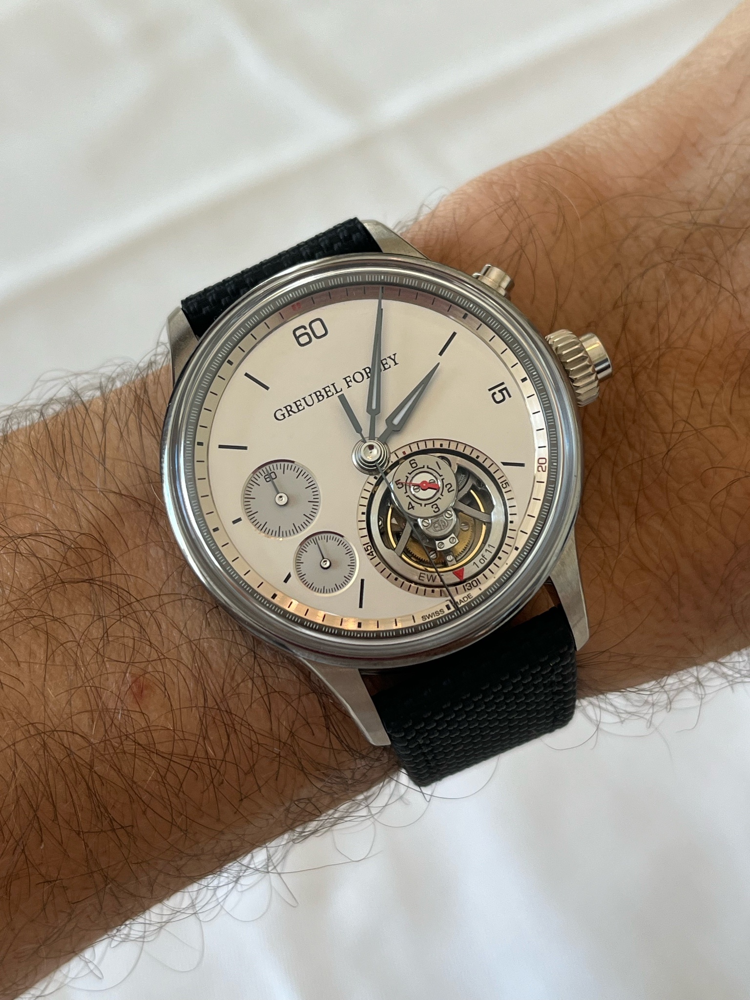 In my opinion, Gruebel Forsey has found a successful style for a contemporary high end chronograph. It's a bit more laid-back than the Gronograaf, which will make it a bit easier to wear casually. The crowding of the functions between 4 and 9 o'clock gives it a strange balance that isn't present in other daring designs.