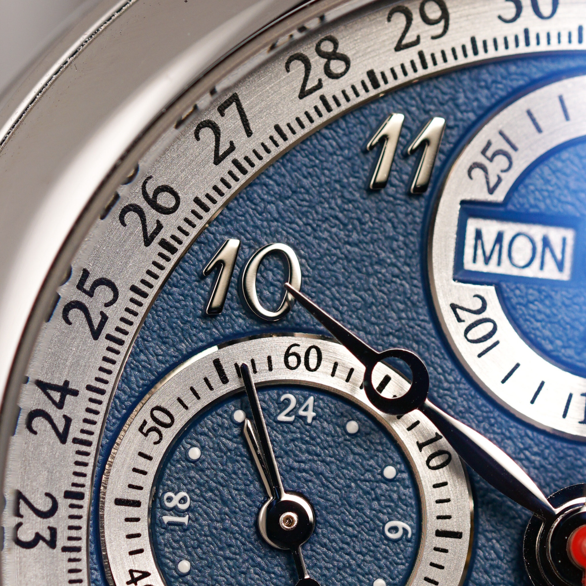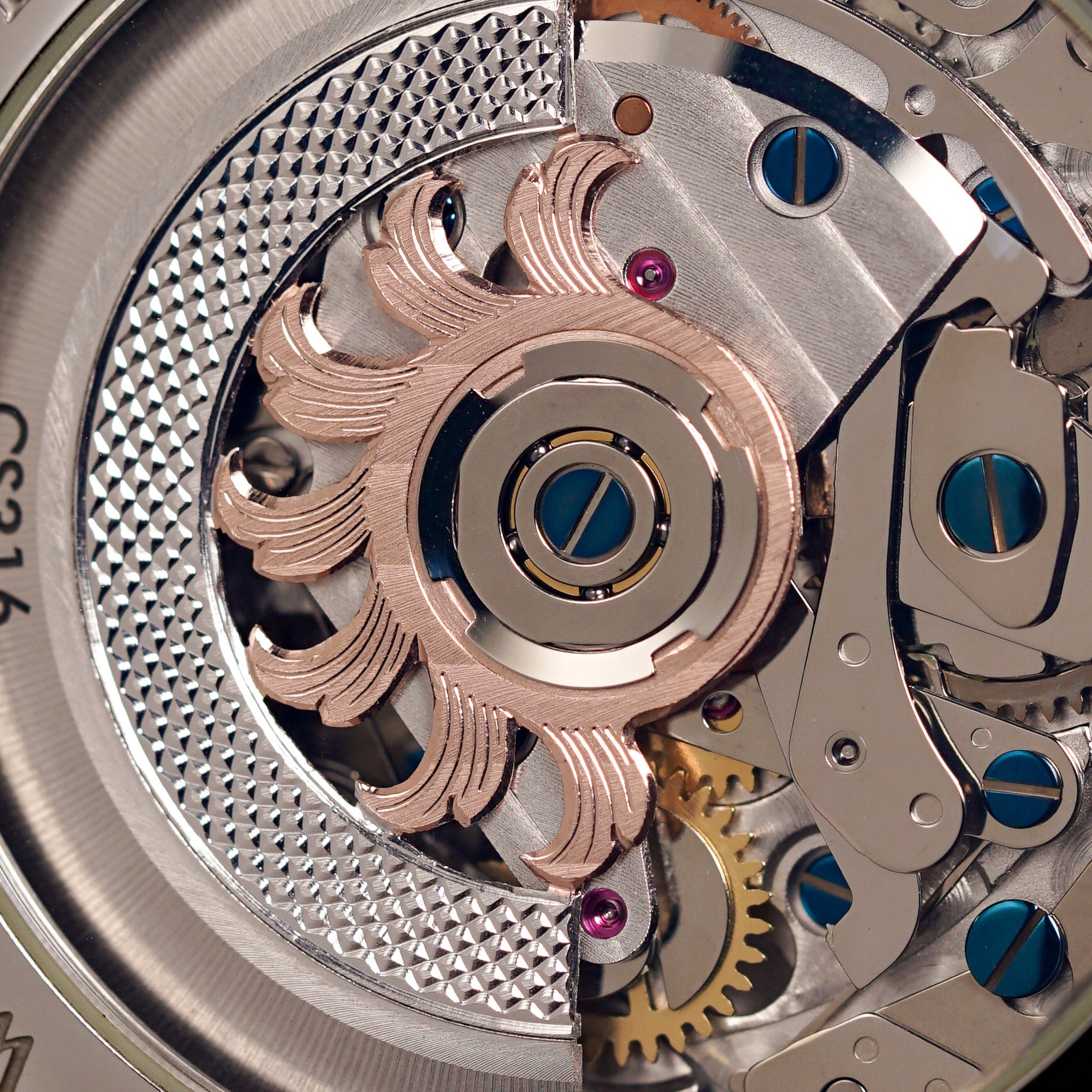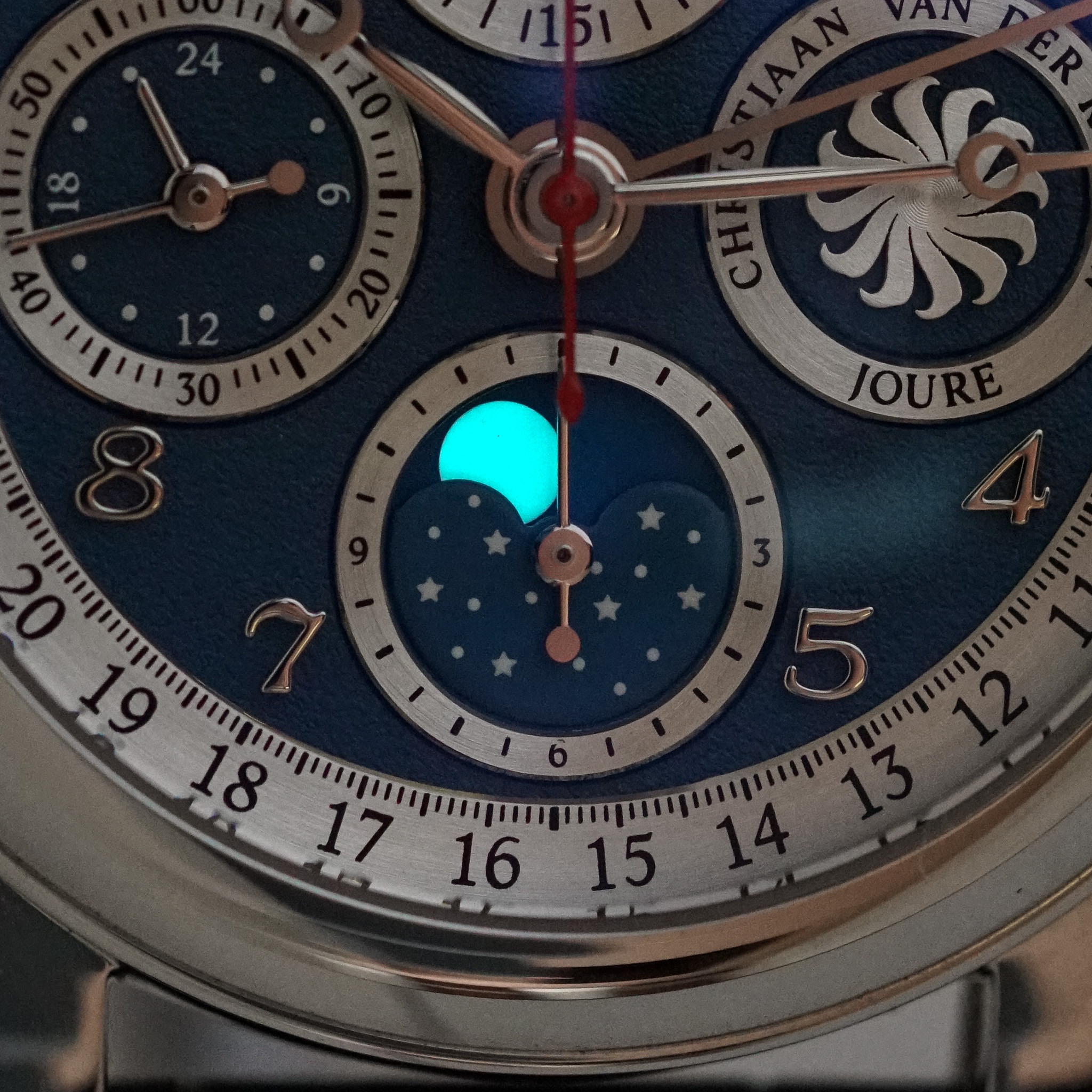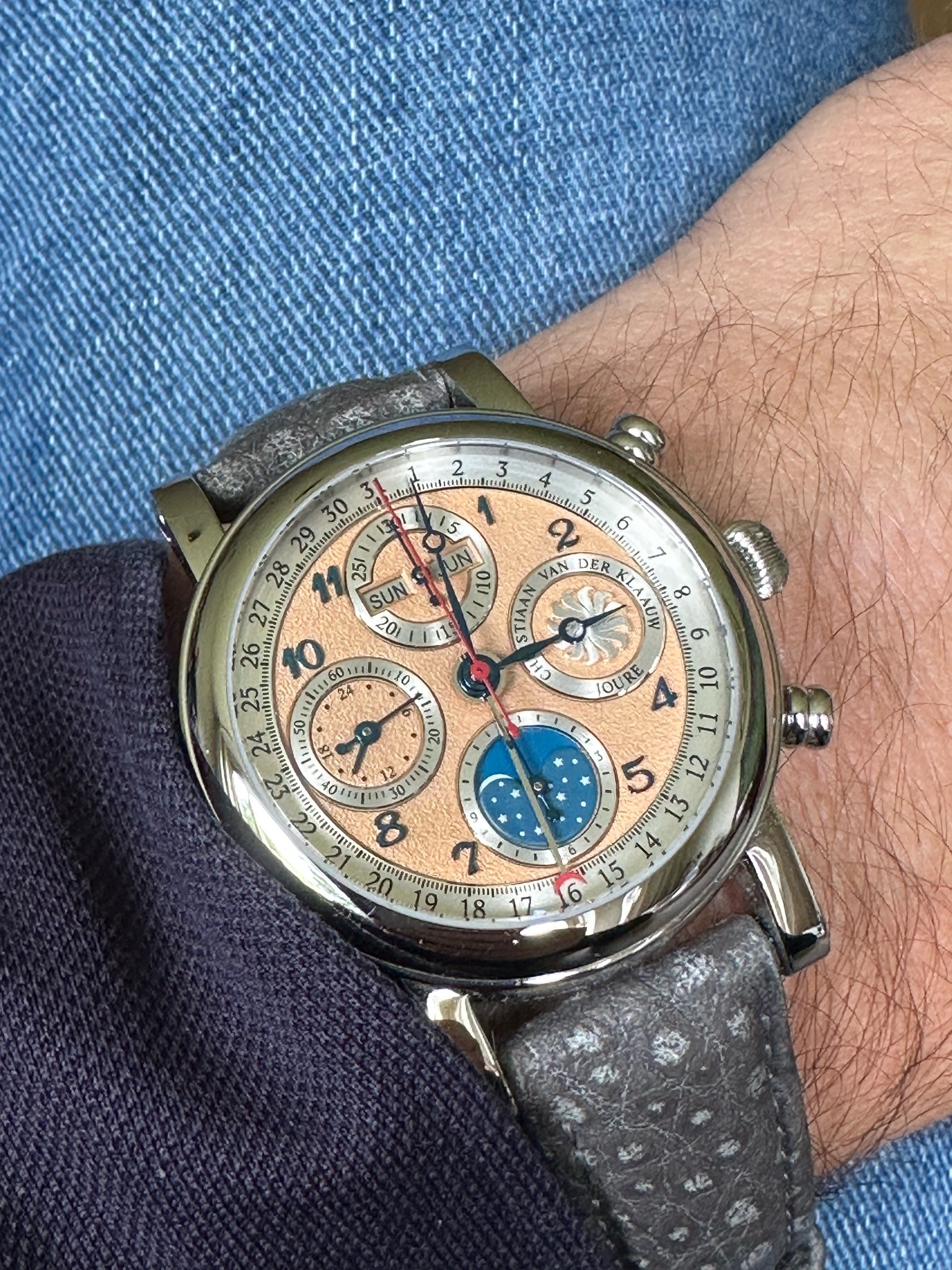 Christiaan Van Der Klaauw is a Dutch independent specializing in astronomical automatons and time pieces. They have been around for a while. They don’t get much love (not Swiss or German) and not enough people know about them. I’m not sure why that’s the case. This is their simplest watch in terms of movement, but I always liked the overall execution. I’ve swapped out their deployment band for something a bit more exotic as I wanted a bit of fun. The 12 o’clock Sun is normally blued steel and I had them make mine gold (easier to see in a dark room).