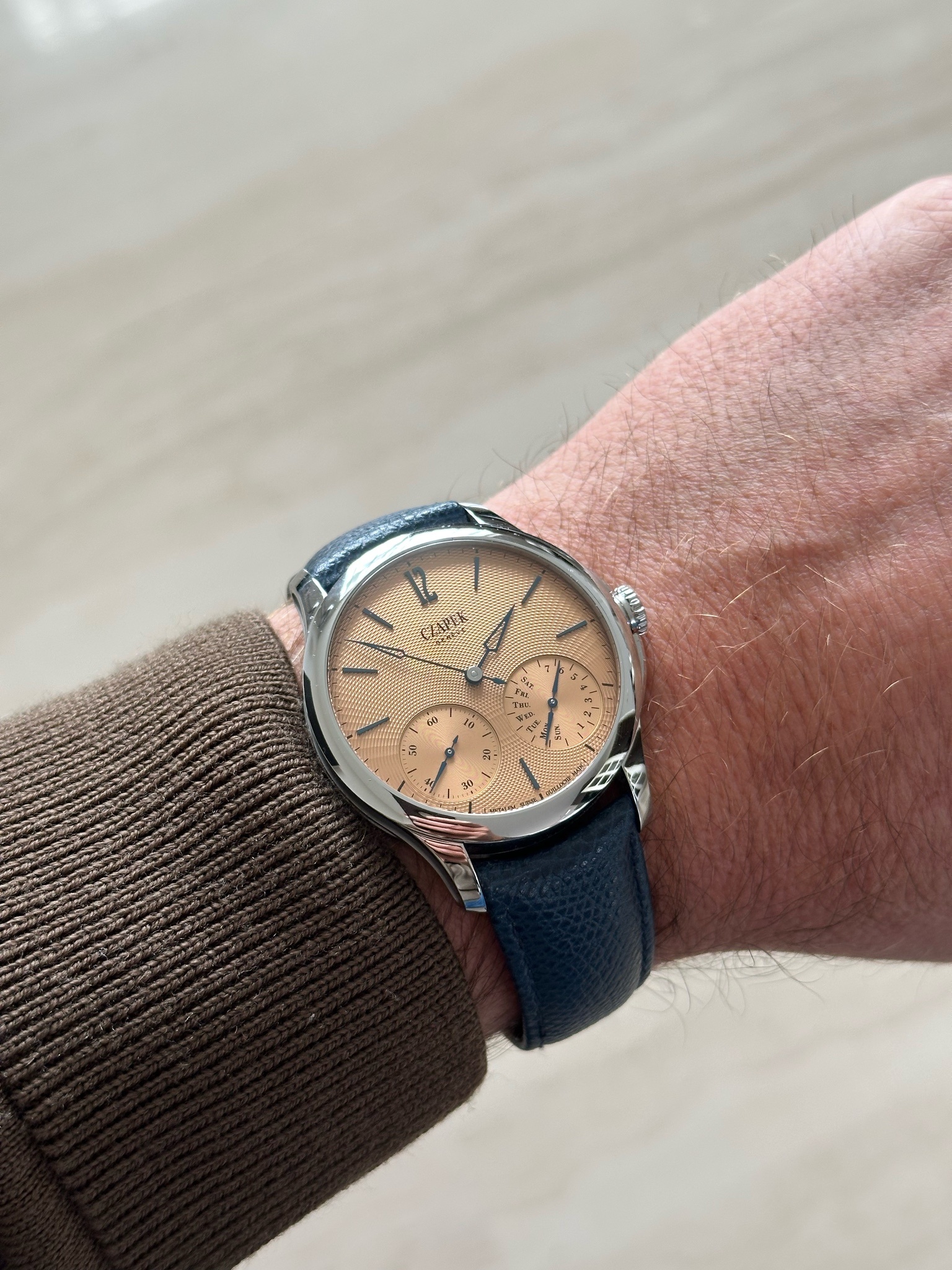 - and a very original 7-day power reserve subdial doubling as a day indicator at 4:30.