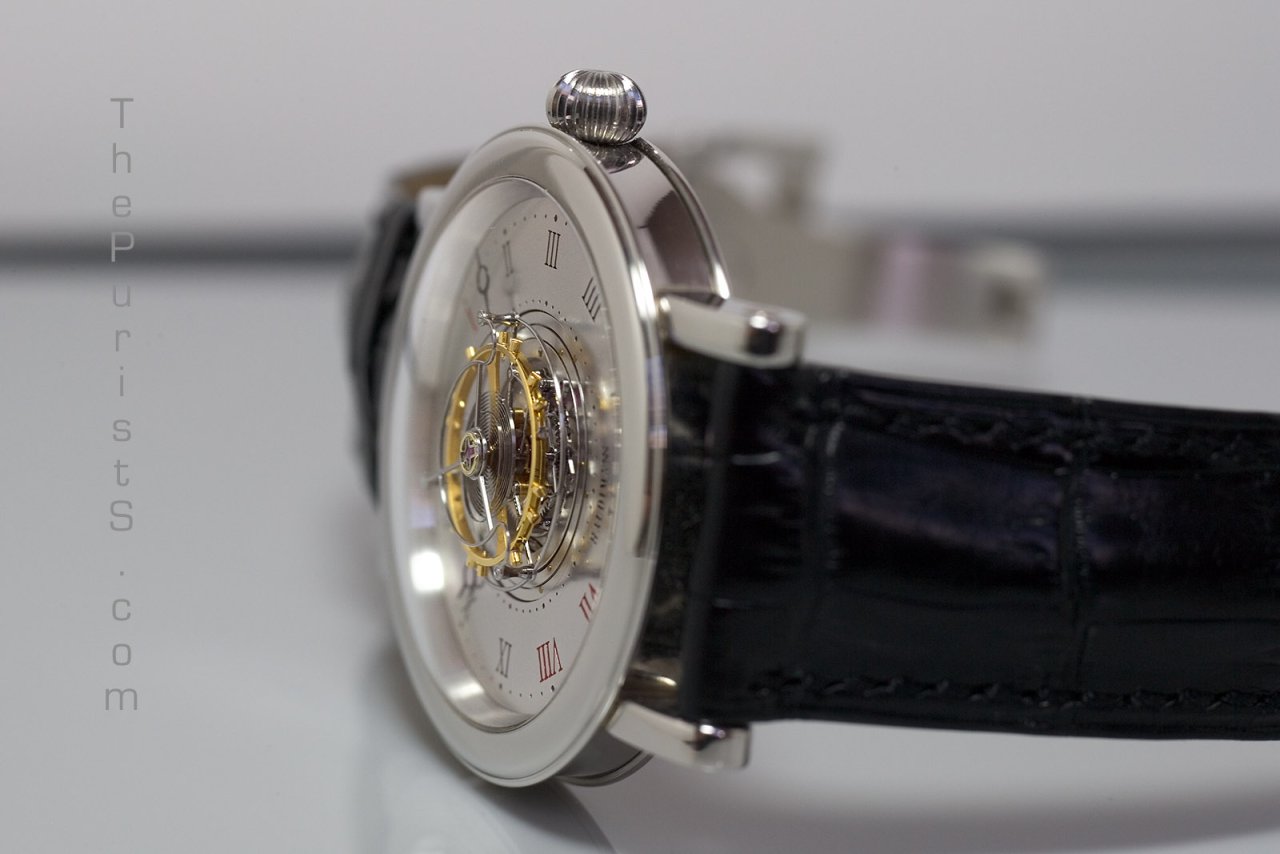 Beat and I worked together on the ideas for the PuristS' Edition because as I lived with a prototype of the original design, it struck me that the purity, the sheer beauty, of the raised, central tourbillon should be showcased, and the unique view of the side of the tourbillon cage in poetic motion, previously only seen through contrived cut outs in the case band, or obscured completely by the dial, should be presented in its full glory. Hence the idea for the flatter bezel and domed, optical grade crystal.