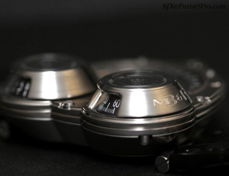 As with all the creations of MB&F, the HM3 is housed in a beautifully constructed and finished case. Max has a sophisticated eye and the attention to detail is evident in the watch. The screw in the case are different from the screws used in the HM1 and 2; if you look closely at the screwheads you'll notice the slots reflect the shape of the case. The metal work is excellent all round; the sapphire crystal and cones are all perfectly fitted.