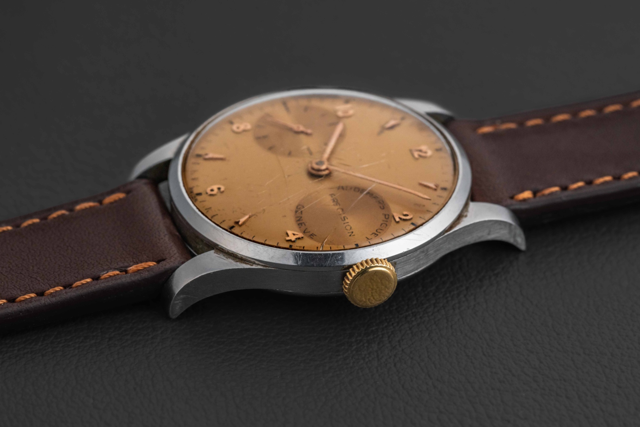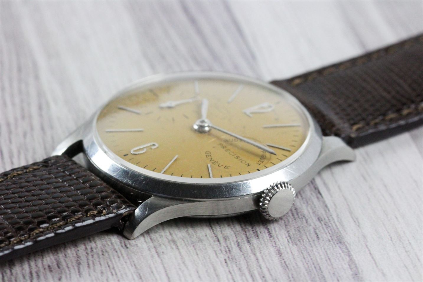 On the dial, the 3 o'clock "subdial" features the brand name, "Geneva" or the number of rubis and the word "Precision"
