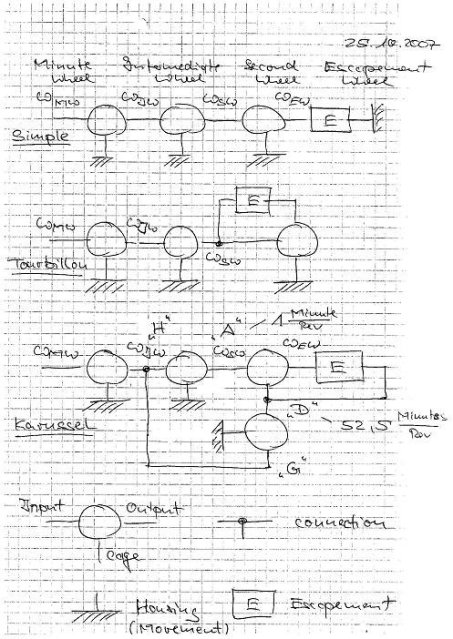 From a scientific point of view there is a considerable difference between the tourbillon escapement and the karussell escapement. The scetch below shows three different gear diagrams. Such diagrams are e.g. used to analyse planetary gear topologies for automotive drivetrains, but are good for watch movements as well ;-)