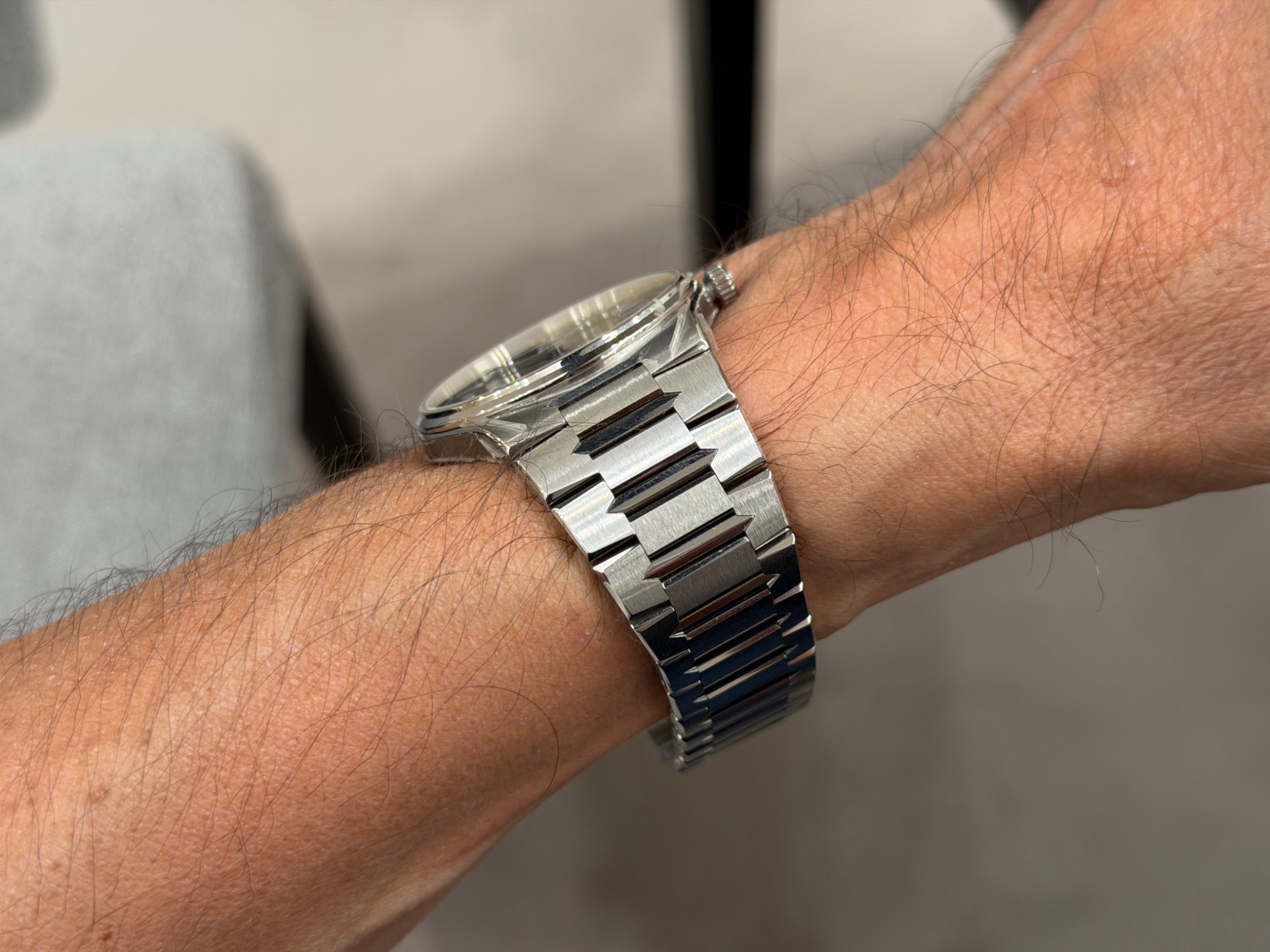 The blue-grey gradient sunray dial is simply wonderful. And the date window with matching date disc is very well executed.