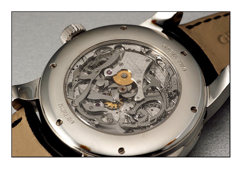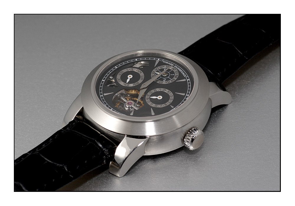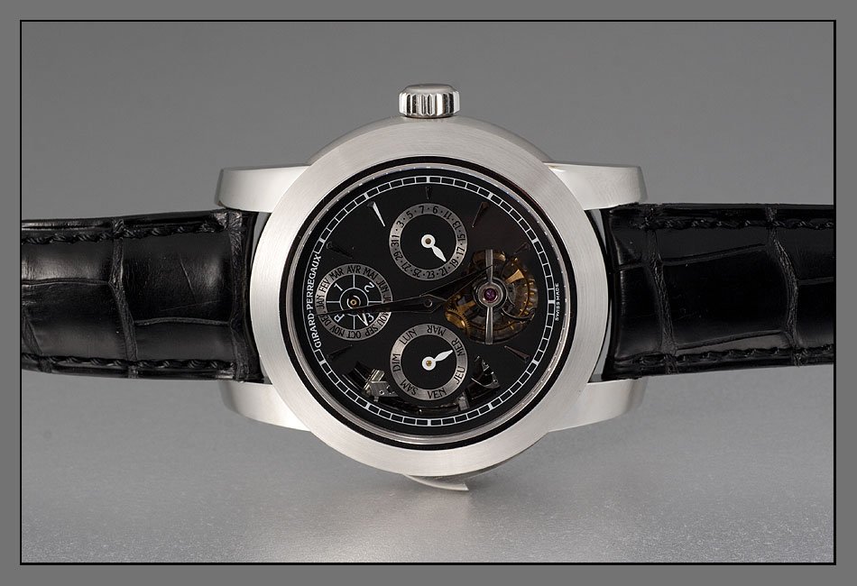 On the model, it´s a GP "Opera TWO". The features sum up for tourbillon with perpetual calendar and a minute repeater with Westminster chimes ("carillon") by use of four hammers and gongs.