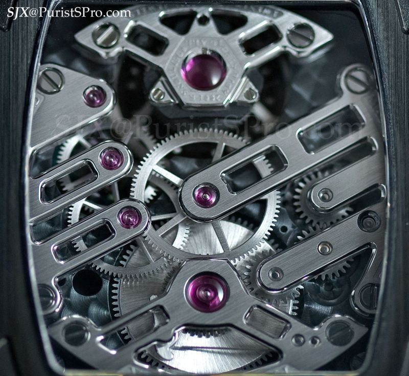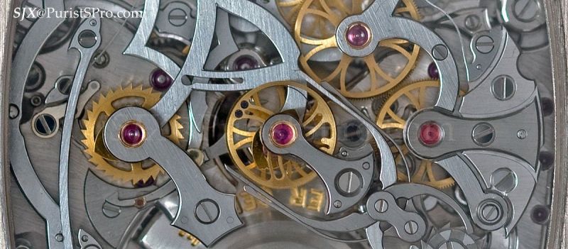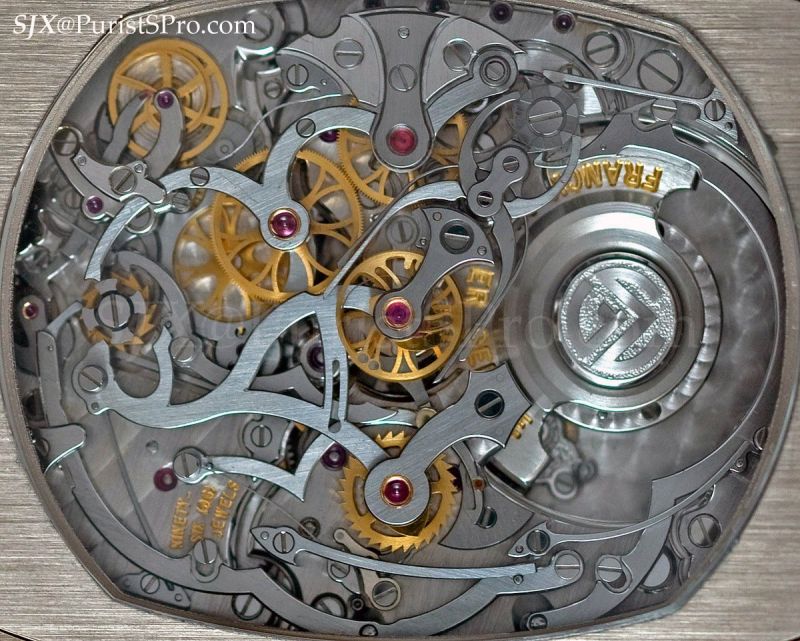 That leaves it with 7 pushers, 99 jewels and over 1400 components. To accommodate all that, the Cintree Curvex case is an ungodly 42 by 61 mm and almost 20 mm high. The movement is a sprawling but attractive expanse of levers and wheels; it bears the aesthetics and finish of a classical Geneva movement in many of its parts.