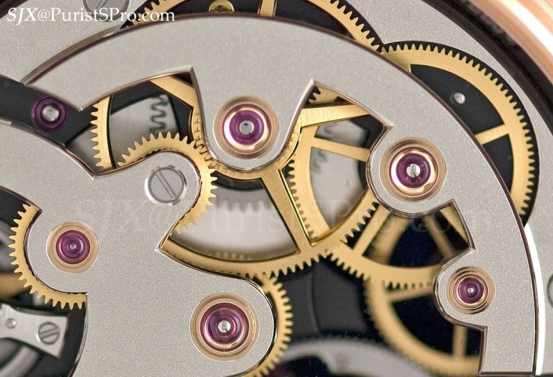 What’s notable about this calibre is the fact that it was designed as a skeleton from the ground up, versus being a skeletonised existing movement, so the bridges and baseplate are integrated into the design of the movement as Roman numerals. All movement edges exhibit a careful bevelling, though the finish of the edges display a regularity consistent with mechanical application. That, however, is consistent with the clean aesthetic of the movement. And at this particular price point, lower than top tier high watchmakers like Lange and Patek but above mid tier firms like JLC, the level of movement finish is highly sufficient.