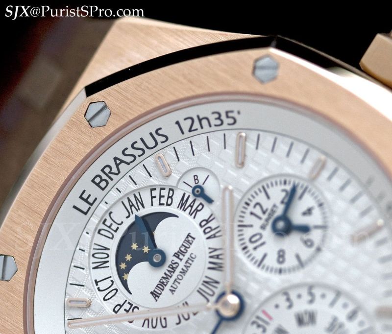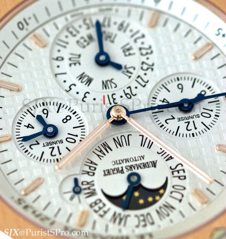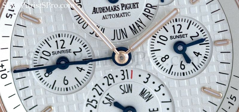 A crowd favourite (at least amongst the non-Offshore crowd) was the Royal Oak Equation of Time. The original EOT was introduced in the round Jules Audemars case with the city coordinates engraved on the bezel, in an unsightly font at that, which bothered me. This new Royal Oak version solves that problem by putting the city on the outermost dial ring.