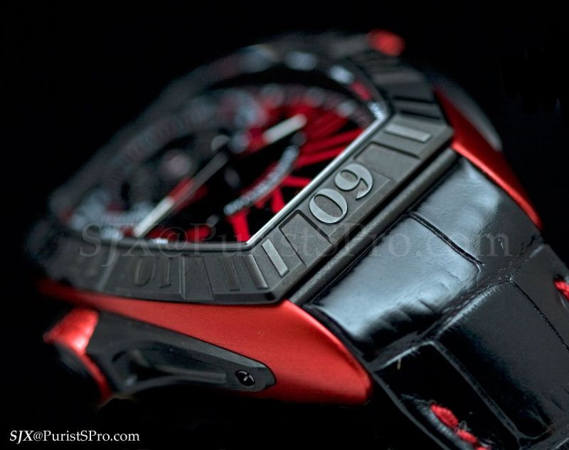 Ergal can be anodised in various colours and one of them is a bright, electrifying red. Red, when found in watchmaking, is typically enamel, ceramic, carbon fibre or some plastic, all of which have a different tone from anodised metallic red. The red Ergal case retains the shine and grain of the metal yet is extremely vivid.