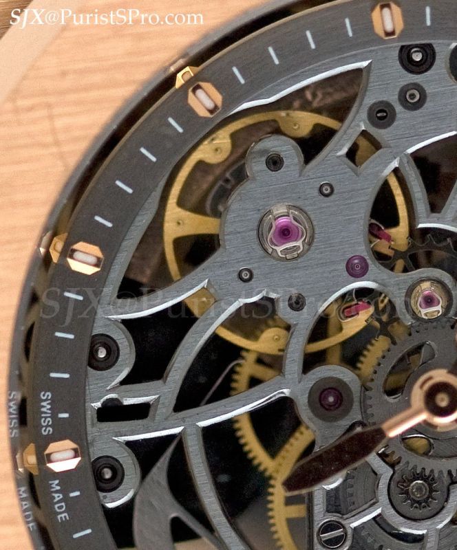 It uses the 9455 MC calibre manufactured in Geneva and is derived from the Roger Dubuis tourbillon calibre though it has been heavily and evidently modified. The movement has the Geneva Seal and is a marginally better finished than the Santos Dumont Skeleton. For instance the keyless works of the tourbillon have a deeper, more evident bevelling than the skeleton. However, the Roman numeral bridges exhibit a similar sharply bevelled edges as the Santos skeleton.