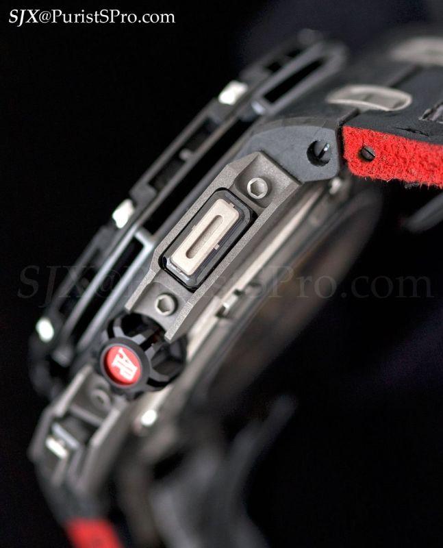 The position of the pushers at 10 and 2 o’clock, coupled with give the black and red colours give the watch an aggressive look. Its light weight gives it an unobstrusive feel on the wrist (only 69 g) though I am wary of the resistance of both ceramic and forged carbon to sharp knocks.