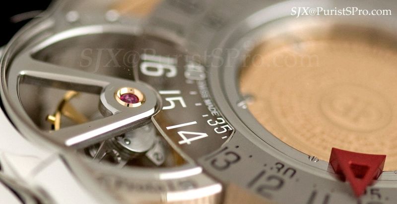 This watch has no dial, save for sapphire on the perimeter of the face, instead GF has thrown the dial side open and exposed the intricacies of the movement. As a consequence the watch has a remarkable sense of depth, and when viewed sideways the perception of depth is compounded by its height since it is fairly thick. I particularly like the three legged bridge that supports the hands, which has a remarkably architectural feel to it.