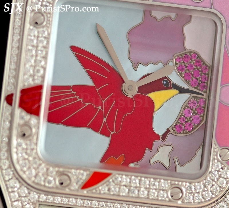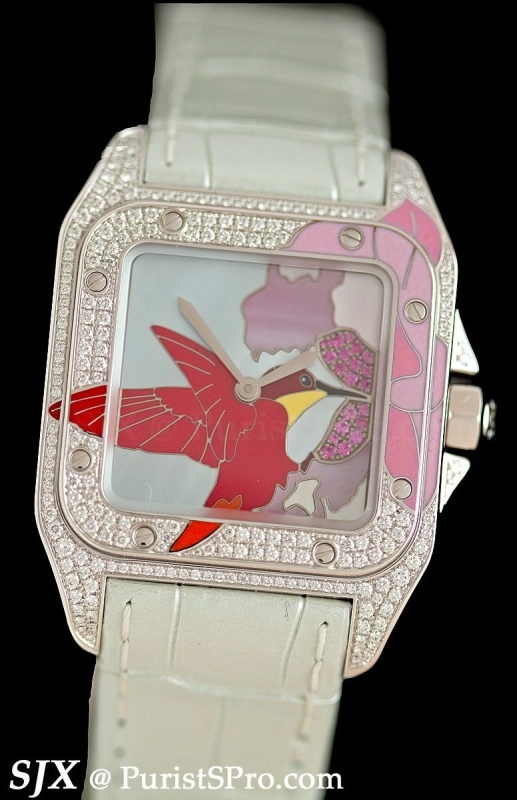 Also decorated with the same enamel technique is this Santos 100 with hummingbird motif. Like the monkey Ballon Bleu, this Santos is not to my taste though I respect the craft it embodies.