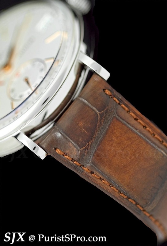 Built on the same base movement as the Automatik is the Saxonia Dual Time. This is a straightforward dual time zone watch with the home time hand in blue steel and the day/night indicator at 12 o’clock. When not needed the home time hand can be hidden under the local time hour hand. And the buttons on the case advance the local time hand forwards or backwards in one hour intervals. Like the Saxonia Automatik this is only in rose or white gold.