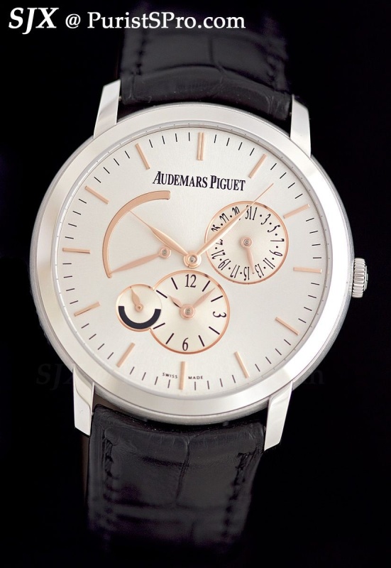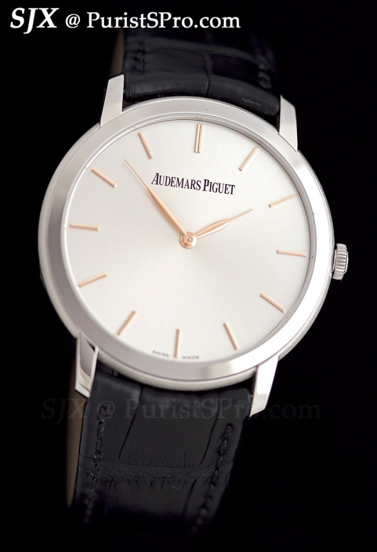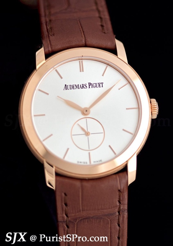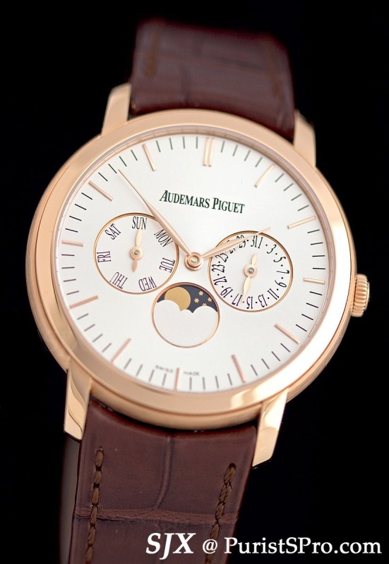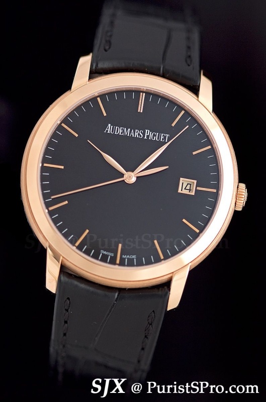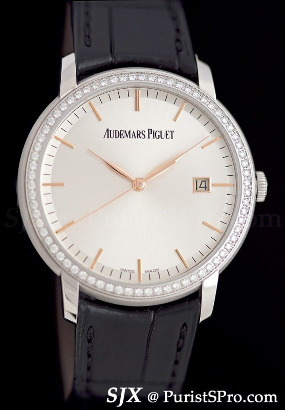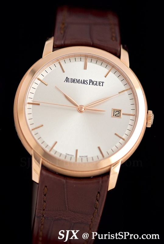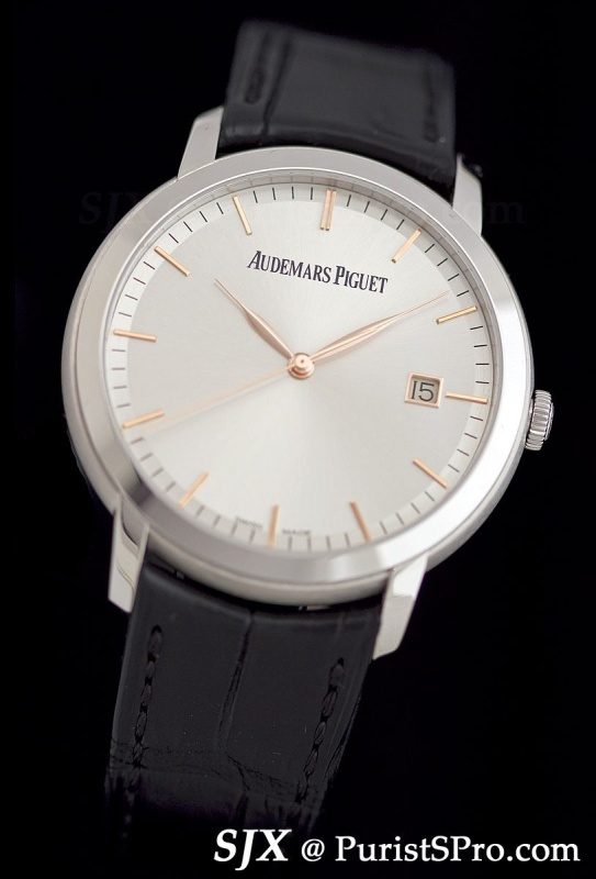 Starting with the simplest, the Jules Audemars Selfwinding. Measuring 39 mm in pink or white gold, with several dials available as well as the option of a diamond bezel, this contains the in-house cal. 3120.