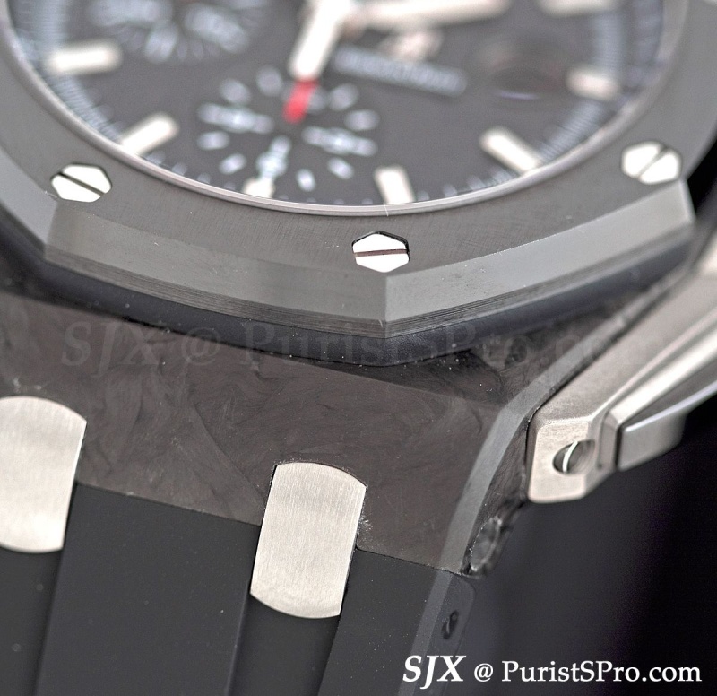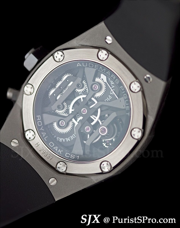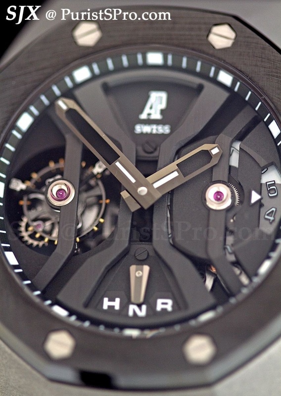 The second complicated Royal Oak presented was the Royal Oak Concept CS 1. Looking much sleeker and unadorned than its predecessors this features a second time zone indicator at three. The bezel is ceramic (I did a bad job of wiping it down as you can see from the pictures) but I cannot recall what the case material is and can’t find anything in the press notes, probably titanium?