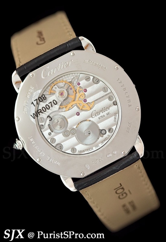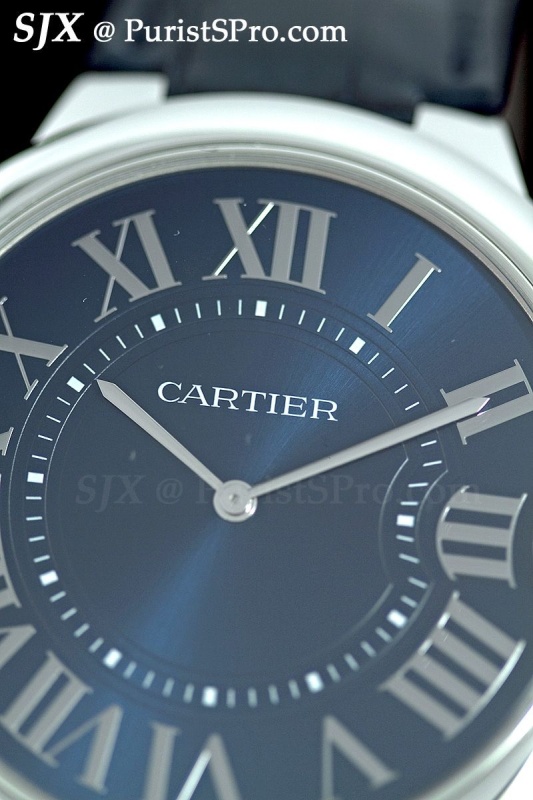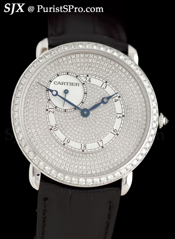 Also new for 2011 is the Ronde Louix Cartier XL with eccentric seconds at 10 pm, a dead giveaway for the Piaget movement inside. I never liked the 10 o’clock seconds on the Piaget and I still don’t like it here. This is available in several dial variations, including the basic silver-tone guilloche, but for some reason I only have photos of the diamond pave dial.