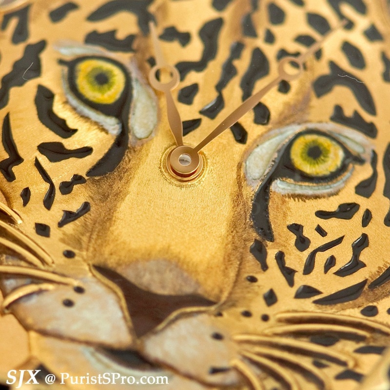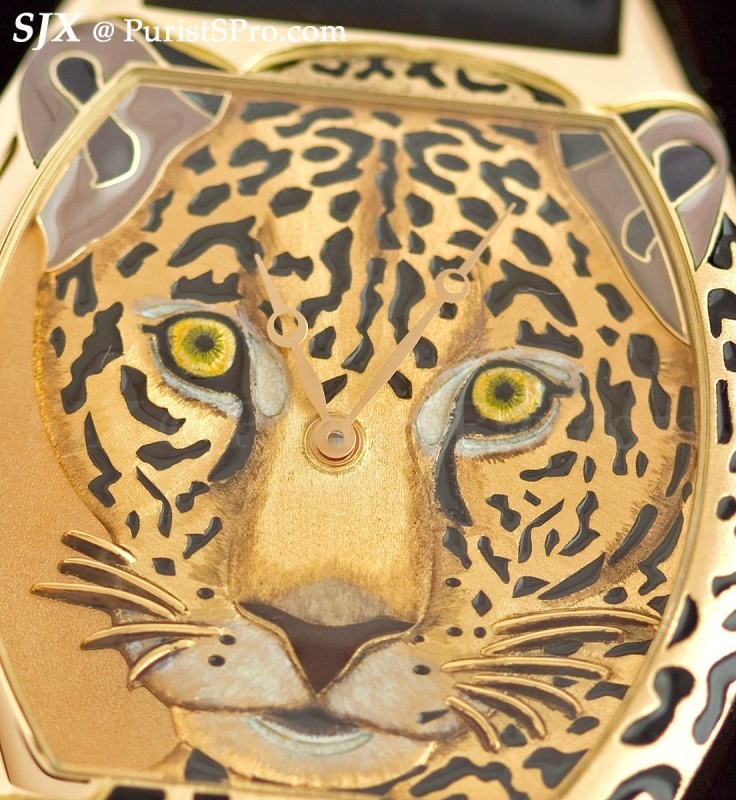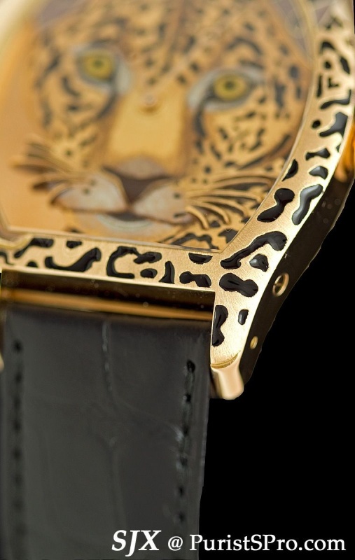 One of my favourite watches of the fair is the Tortue XL jaguar motif from the Metier d’Art range. Hand-engraved in relief and decorated with champlevé grand feu enamel, this watch makes a radical statement. The detail of the jaguar is amazing – look at the close-ups of its eyes.