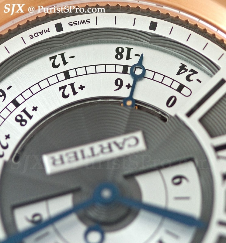 Next is the Calibre de Cartier Multiple Time Zone, one of the most innovative time zone watches I have come across. Home time is shown on the day-night hand in the aperture from four to seven, while local time is shown on the main hands. These are linked to the cities disc on the side of the case which is rotated by a button integrated into the crown guards.