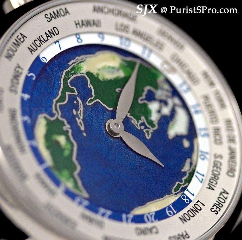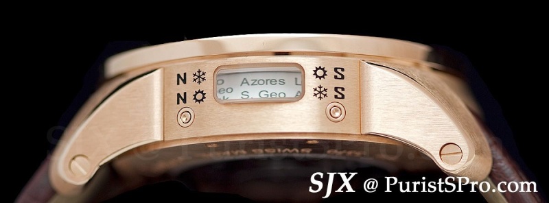 But two features set this watch apart. The first is what Carole Forestier calls a jetlag indicator. Displayed in the window on the upper half of the dial, it shows the difference between the local and home time. Second is summer time which is why the cities disc has two lines. The engraved symbols on the case denote North and South Hemisphere, as well as winter and summer, indicating which line of the city disc to read for the season.
