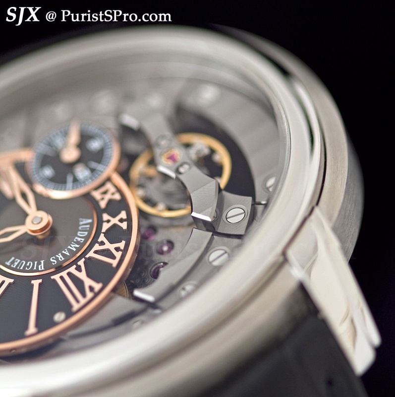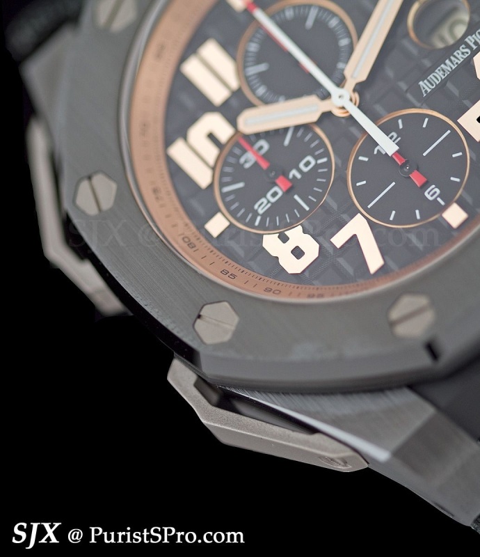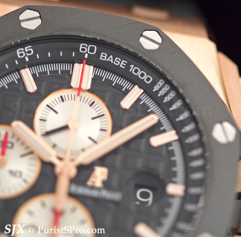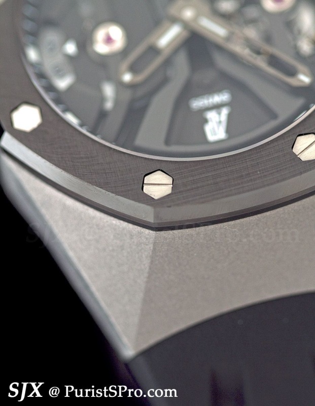 In ceramic and rose gold, the watch is 48 mm with bridges bolted to the sides to make it look bigger. But note the ceramic case and bezel which are beautifully brushed and polished with bevelled edges like a regular metal Royal Oak case – an unusual and praiseworthy feat. I expect more ceramic cases with this level of finishing next year.