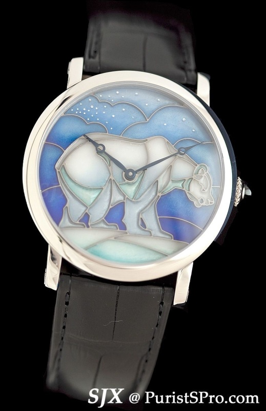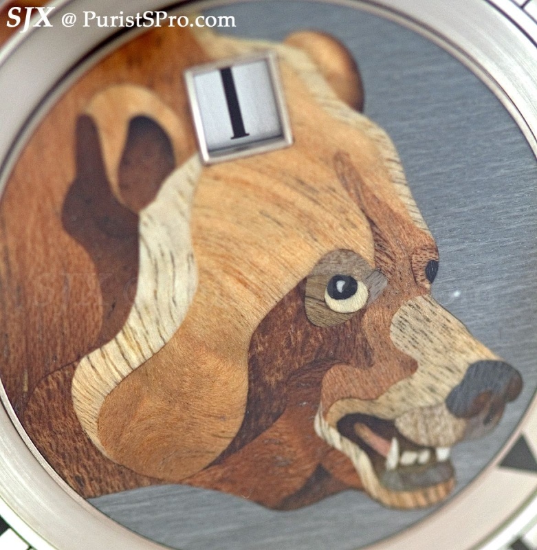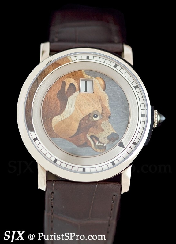 More subtle but no less challenging in terms of technique is the Rotonde de Cartier jumping hours with bear in wood marquetry. 38 pieces of wood which have been painstaking cut into shape are pieced together like a Lilliputian puzzle to form the bear’s head. And though it’s only 38 pieces it takes 160 hours to complete.