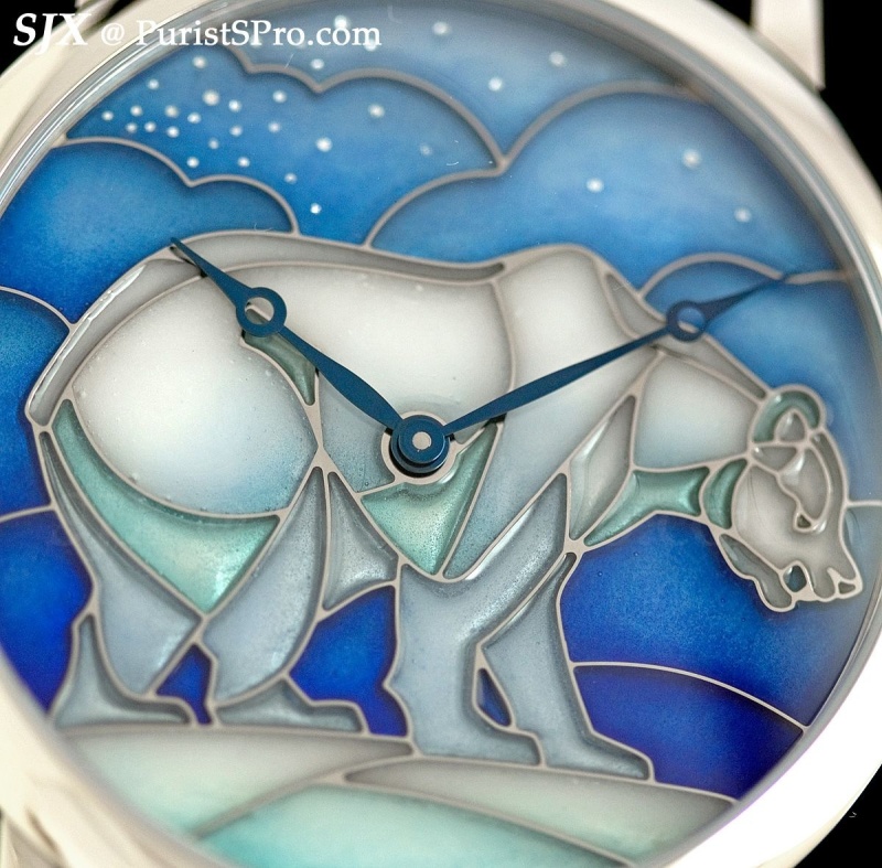 Demonstrating a rarely seen enamelling technique, the Rotonde with bear motif has a dial of plique-à-jour paillonné enamel. Similar in principle to stained glass where the enamel is applied to a skeletonised frame, plique-à-jour paillonné enamel was first used by Cartier in the early 20th century but revived this year for this watch. The graduated tones on the dial are stunning and ethereal.